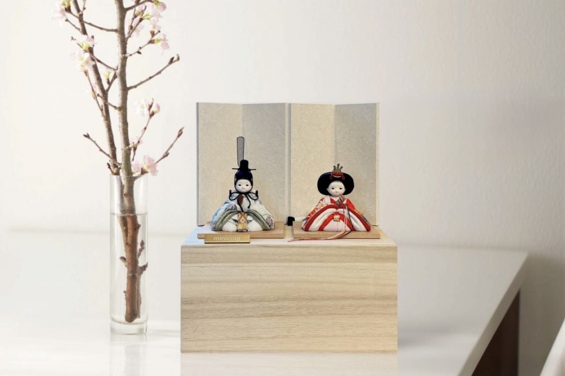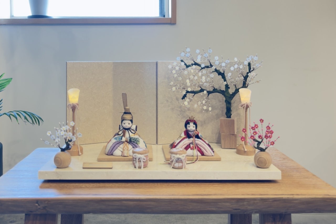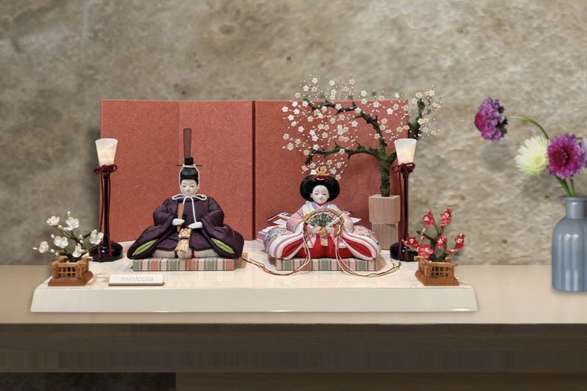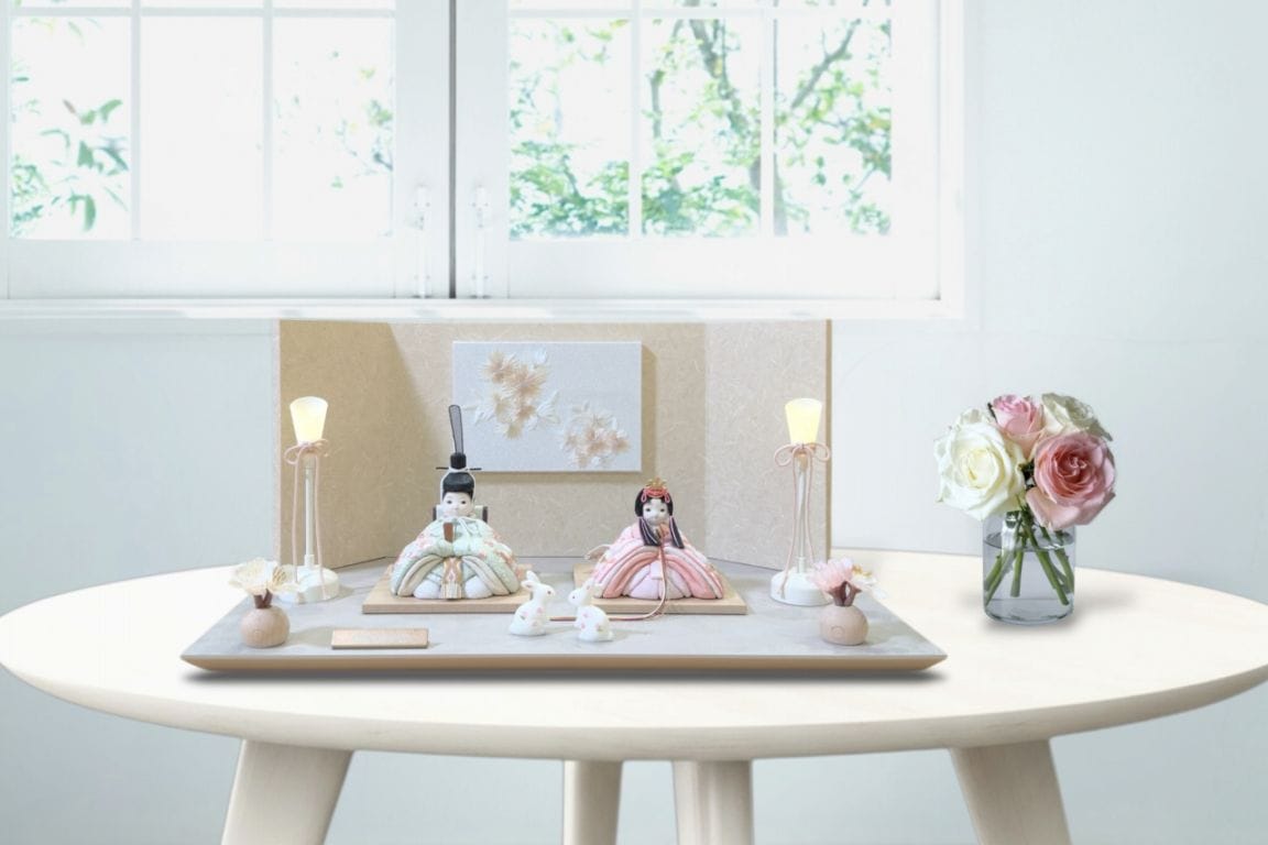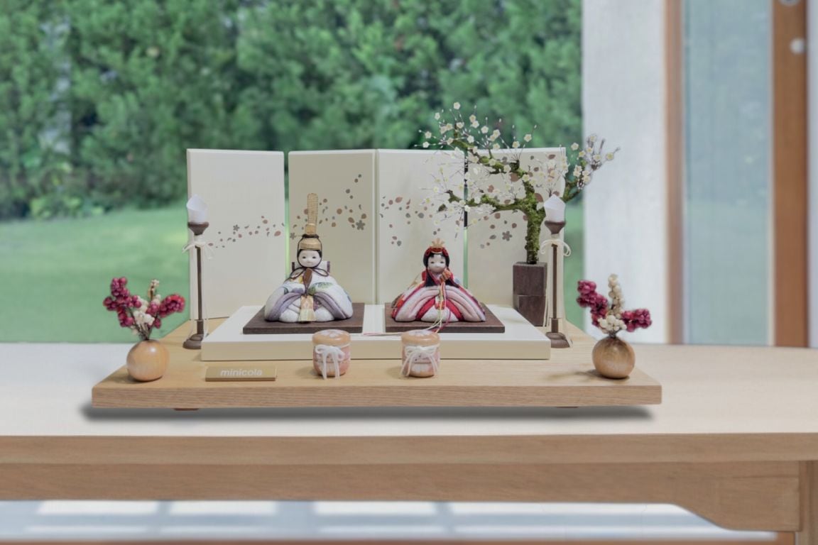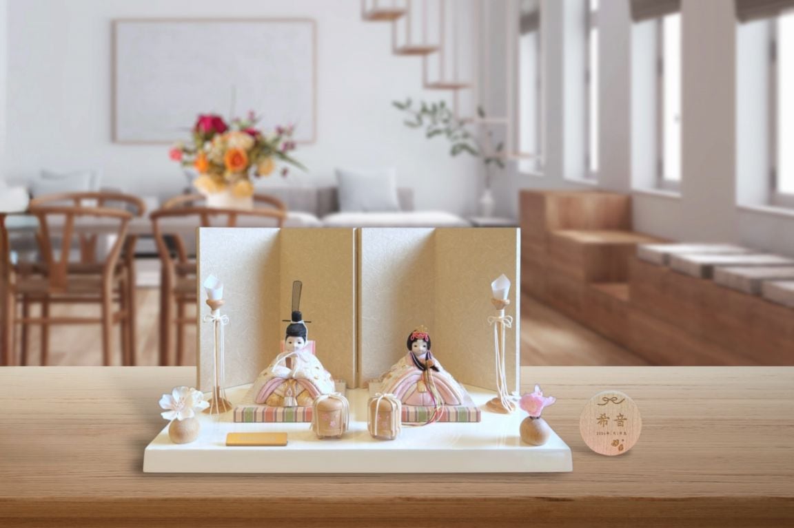 rico結愛(ゆあ)木目込み親王飾り雛人形 高岡塗白台 亜麻色和紙屏風