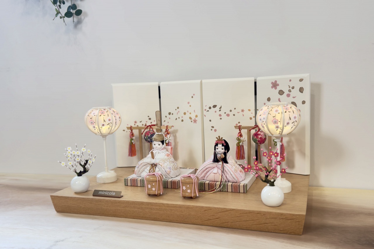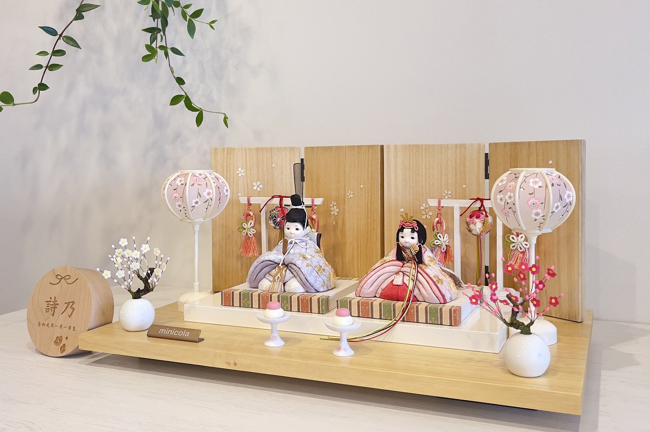 rico葉音(はのん)木目込み親王飾り雛人形 高岡塗台 雪花丸型照明×木ナチュラル屏風