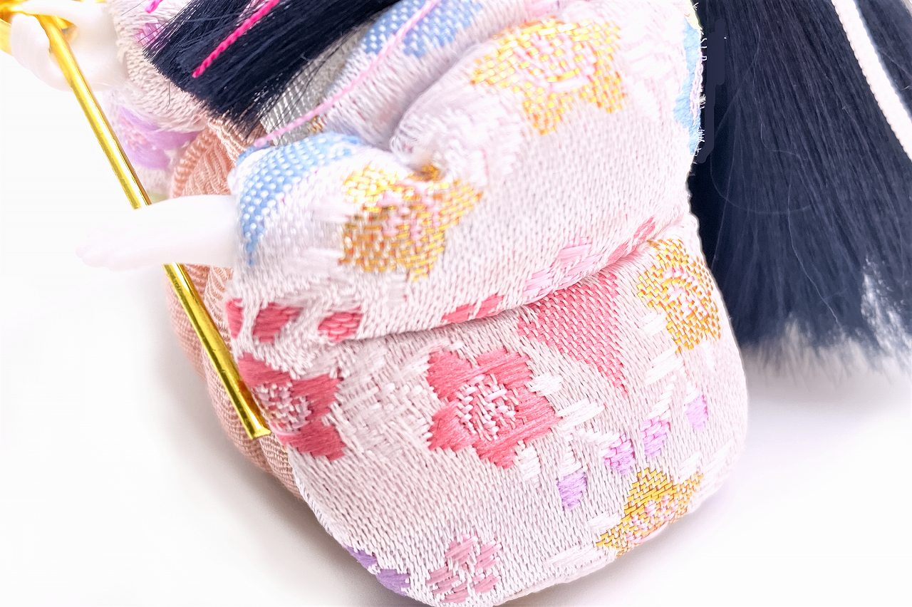 木目込官女、ricoいろは。白地に色とりどりのお花模様のお着物を着た、手のひらサイズの小さな官女です。