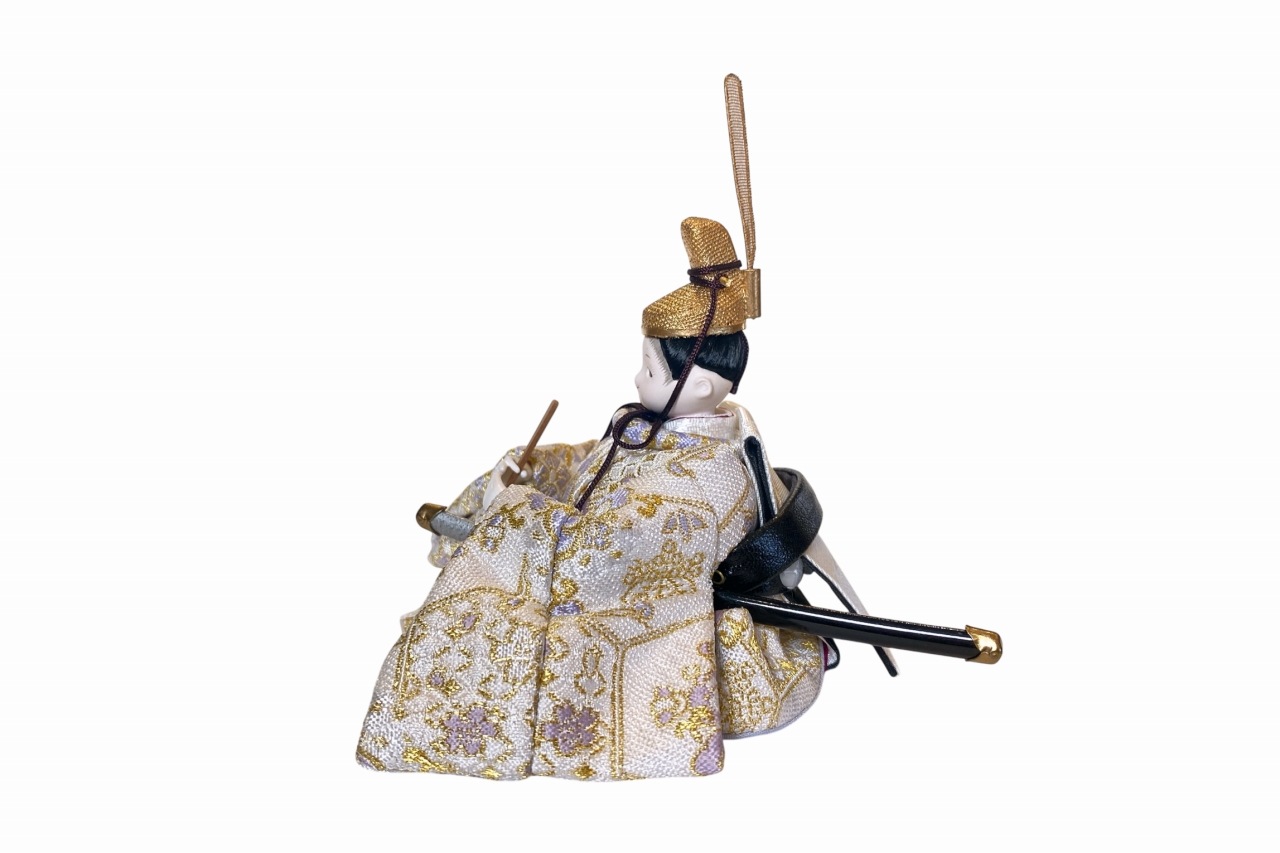 【インスタグラム掲載商品】小さな衣裳着親王飾り雛人形 coco煌(きら)。金糸が織り込まれた、共柄で菱模様のお着物を着たお雛様です。