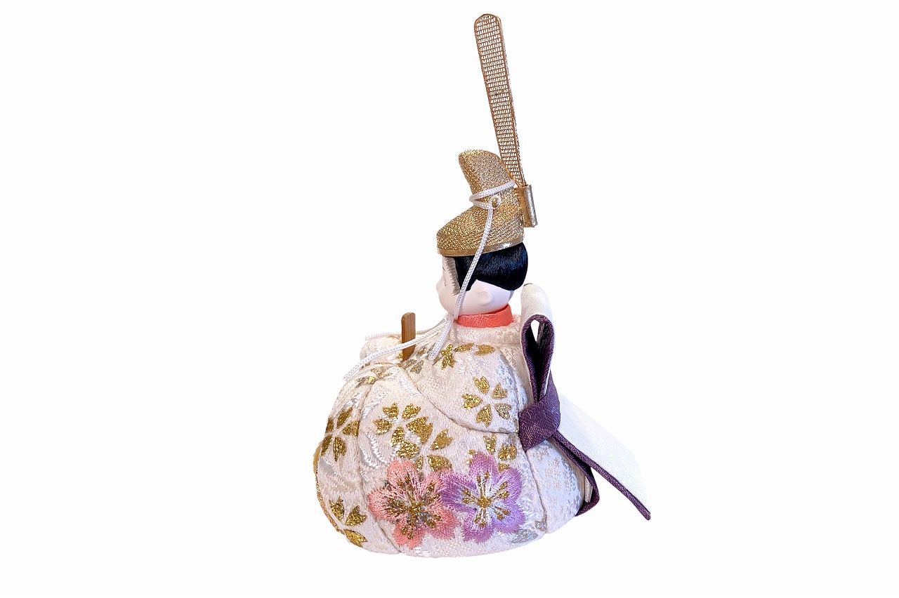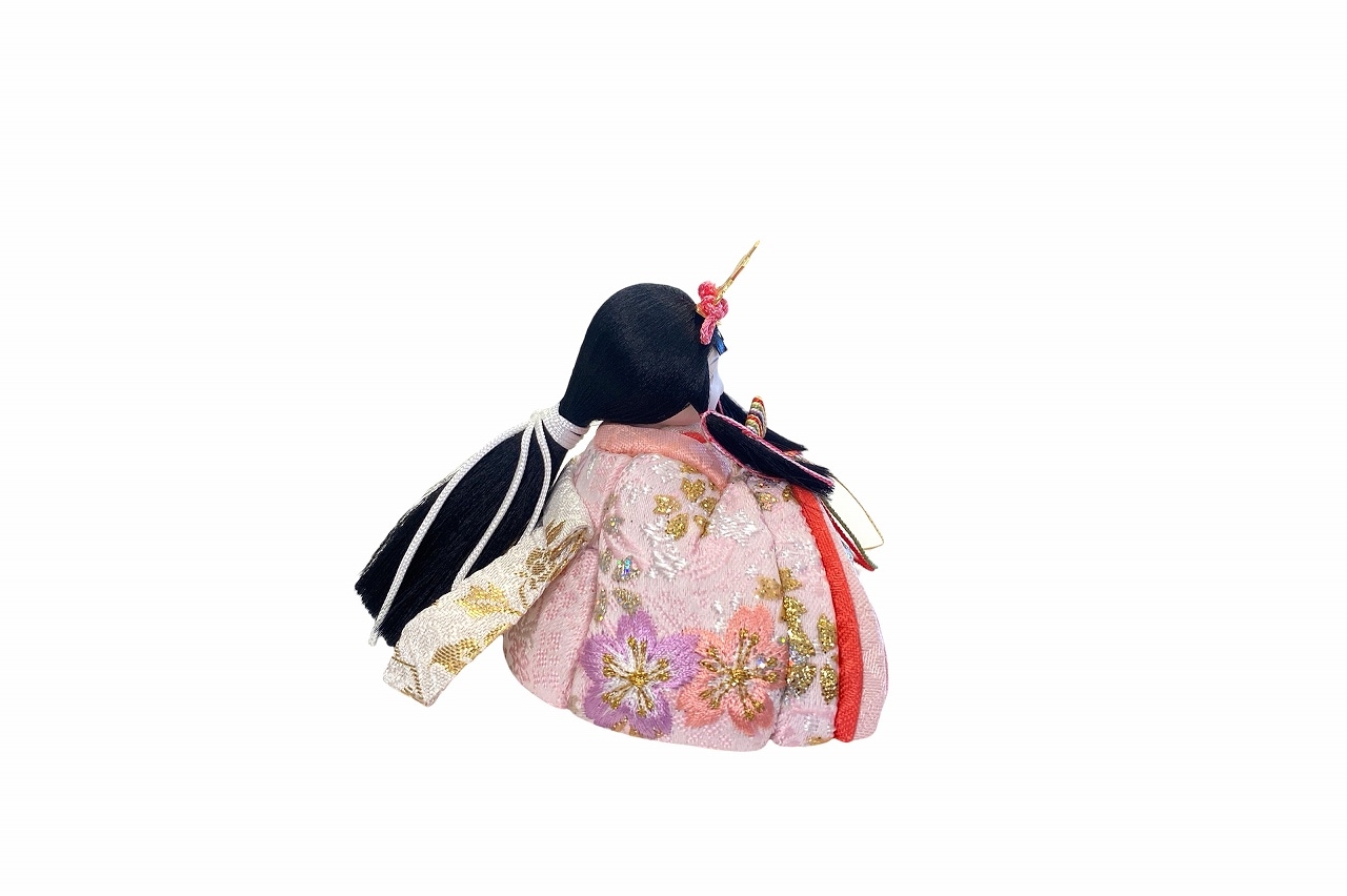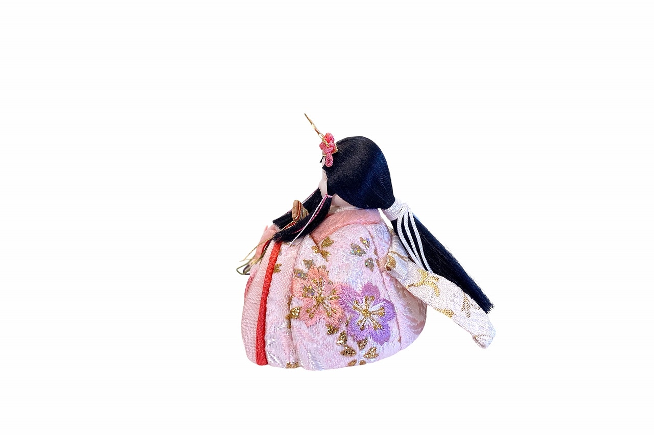 【インスタグラム掲載商品】小さな木目込み親王飾り雛人形 rico美優(みゆ)。キラキラした桜の花びら模様と、桜の刺繍をほどこしたお着物を着たお雛様です。