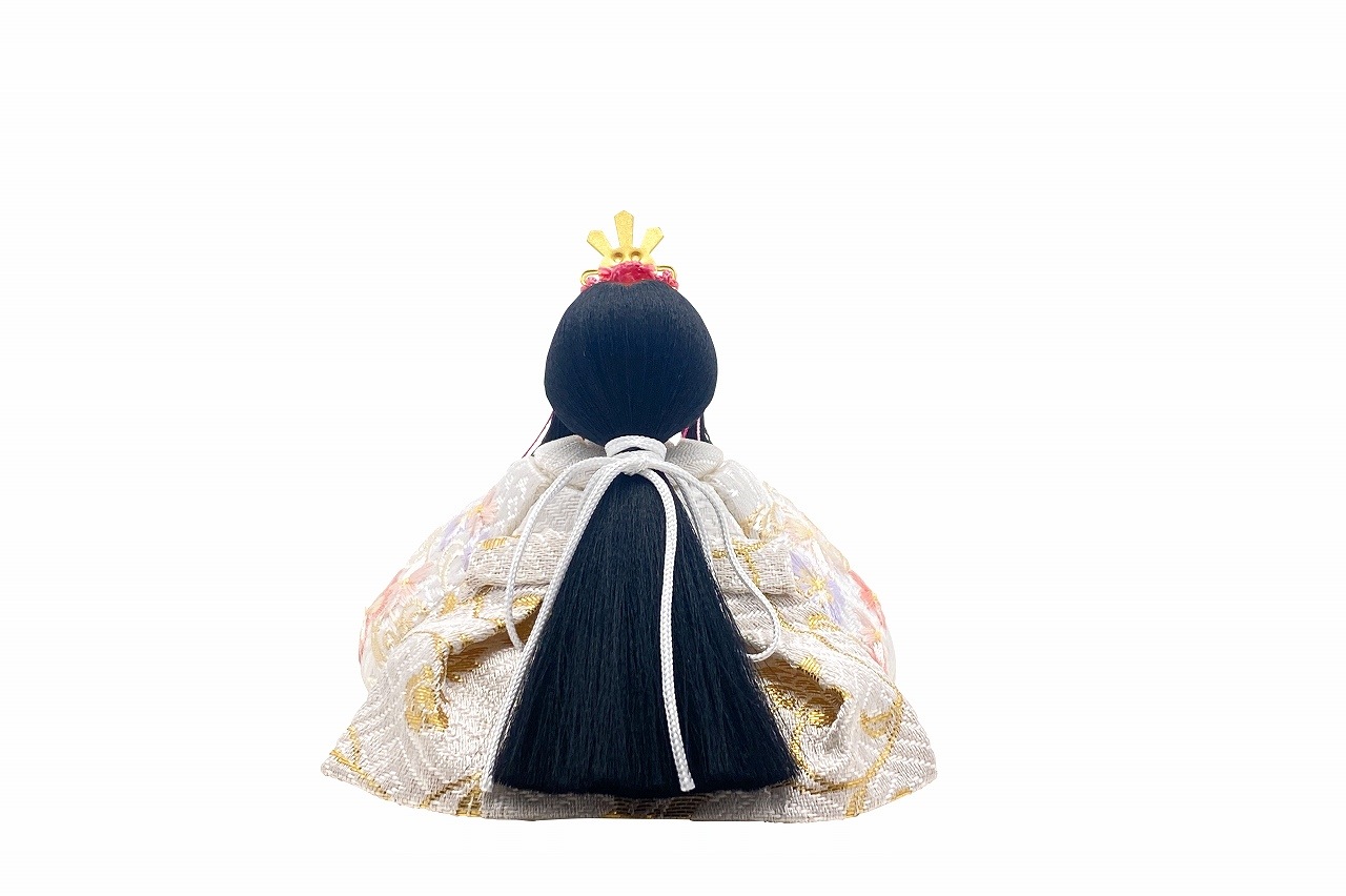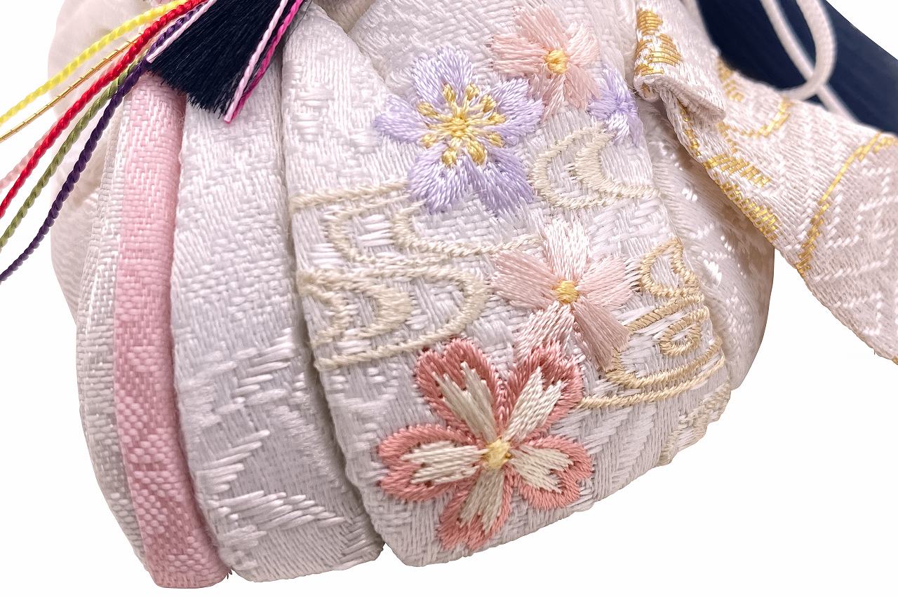 【インスタグラム掲載商品】小さな木目込み親王飾り雛人形。rico初香(ういか) 苦難や災厄を流し去る意味合いがあるとされる清らかな流水模様と、桜の花びらが刺繍された、共柄のお着物です。