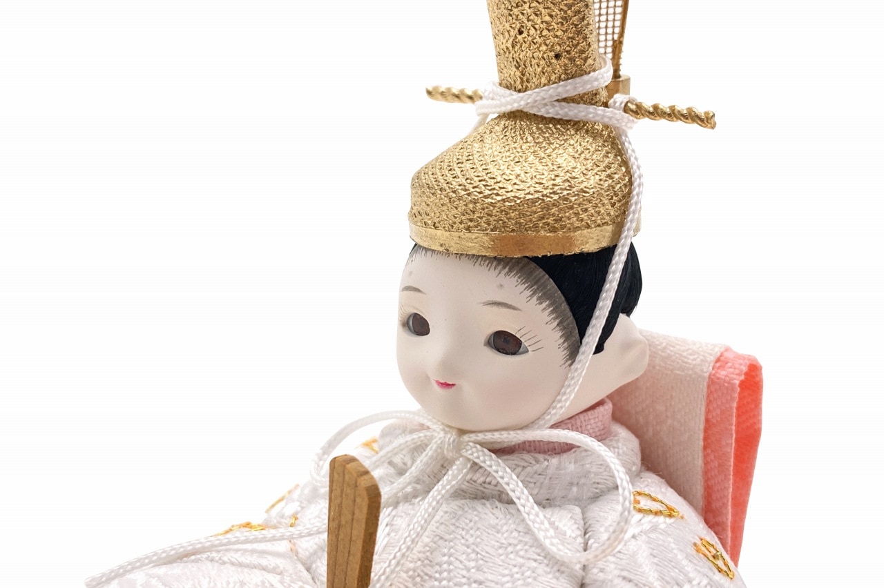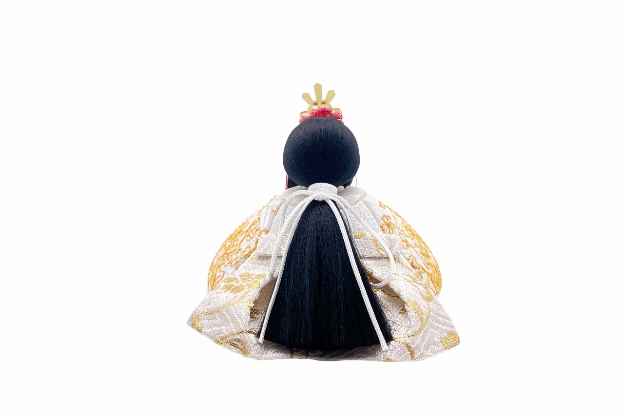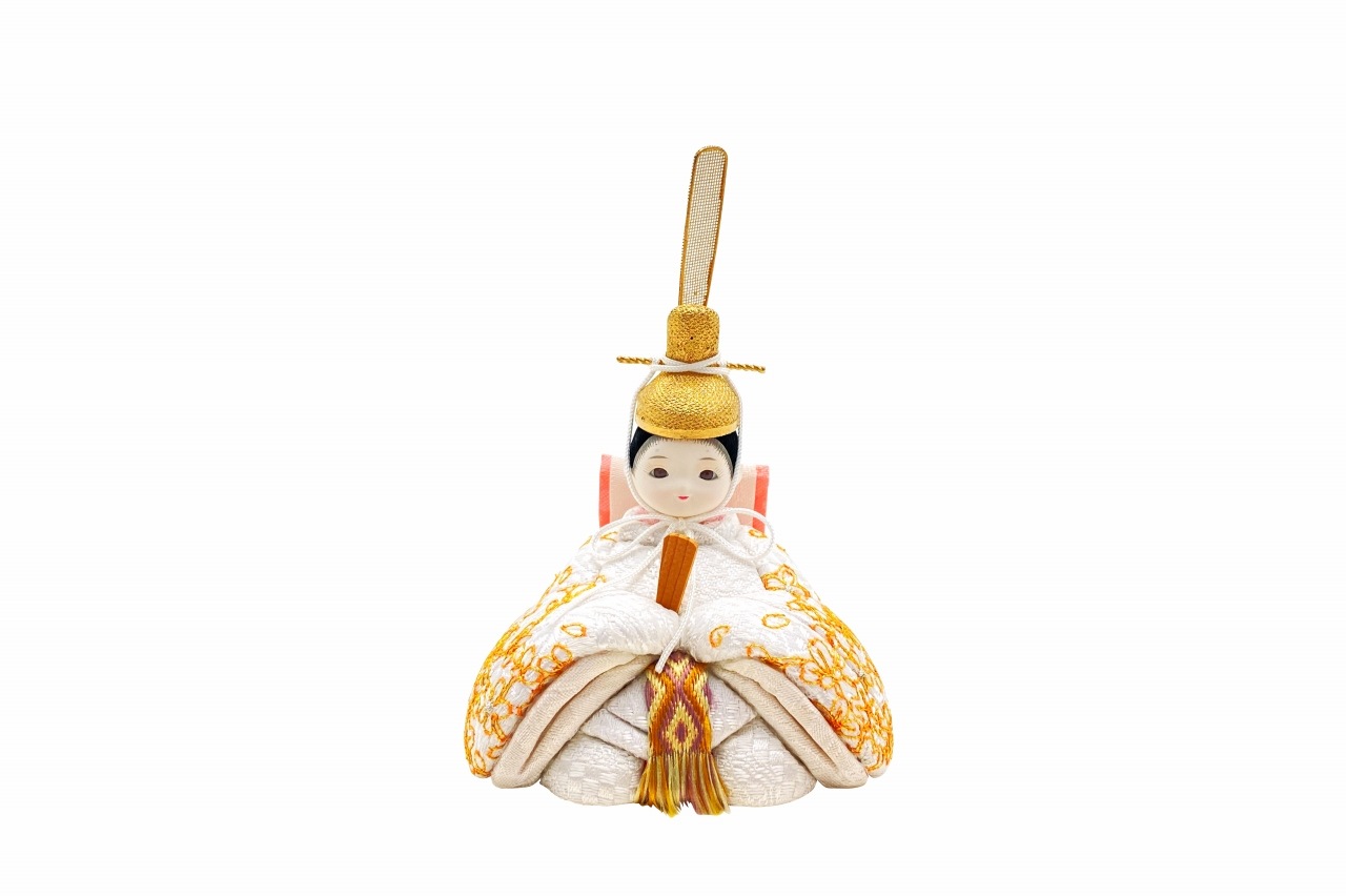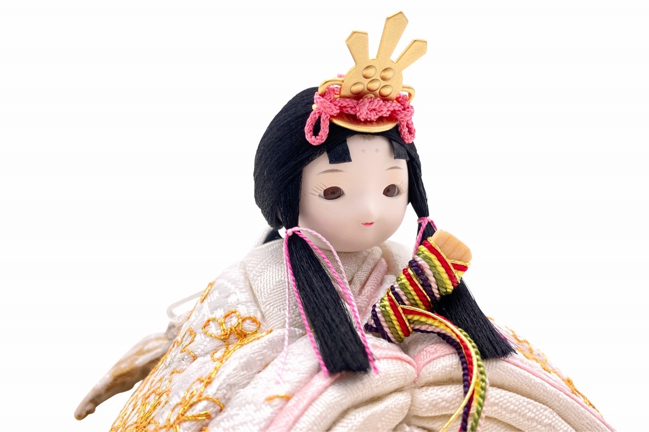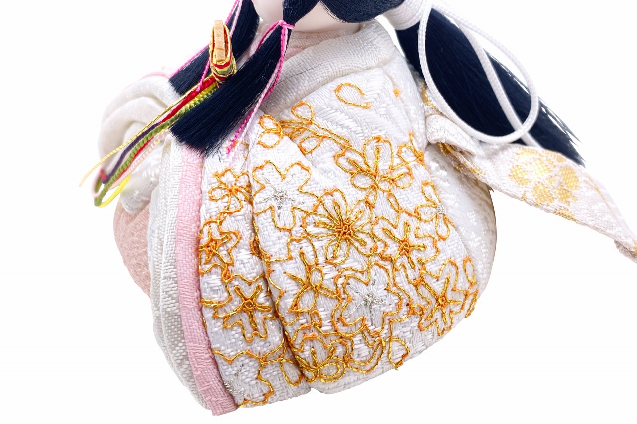 【インスタグラム掲載商品】小さな木目込み親王飾り雛人形 rico真愛(まな)。白地に金糸でたくさんの桜の花びらを刺繍した、おそろいのお着物です。