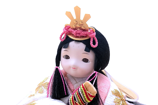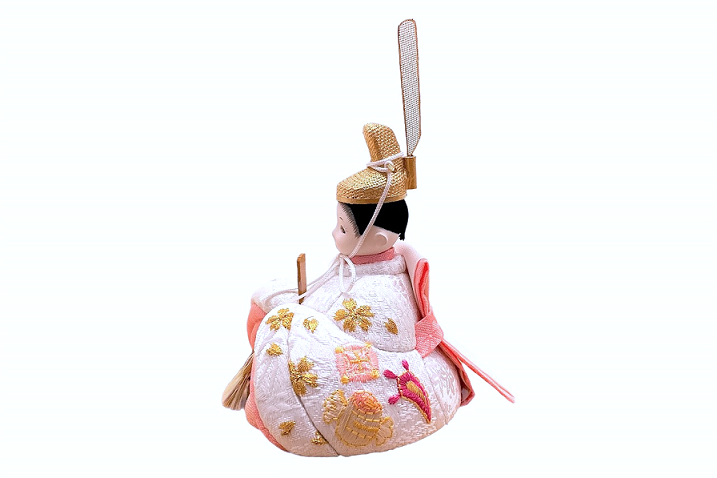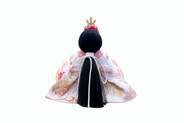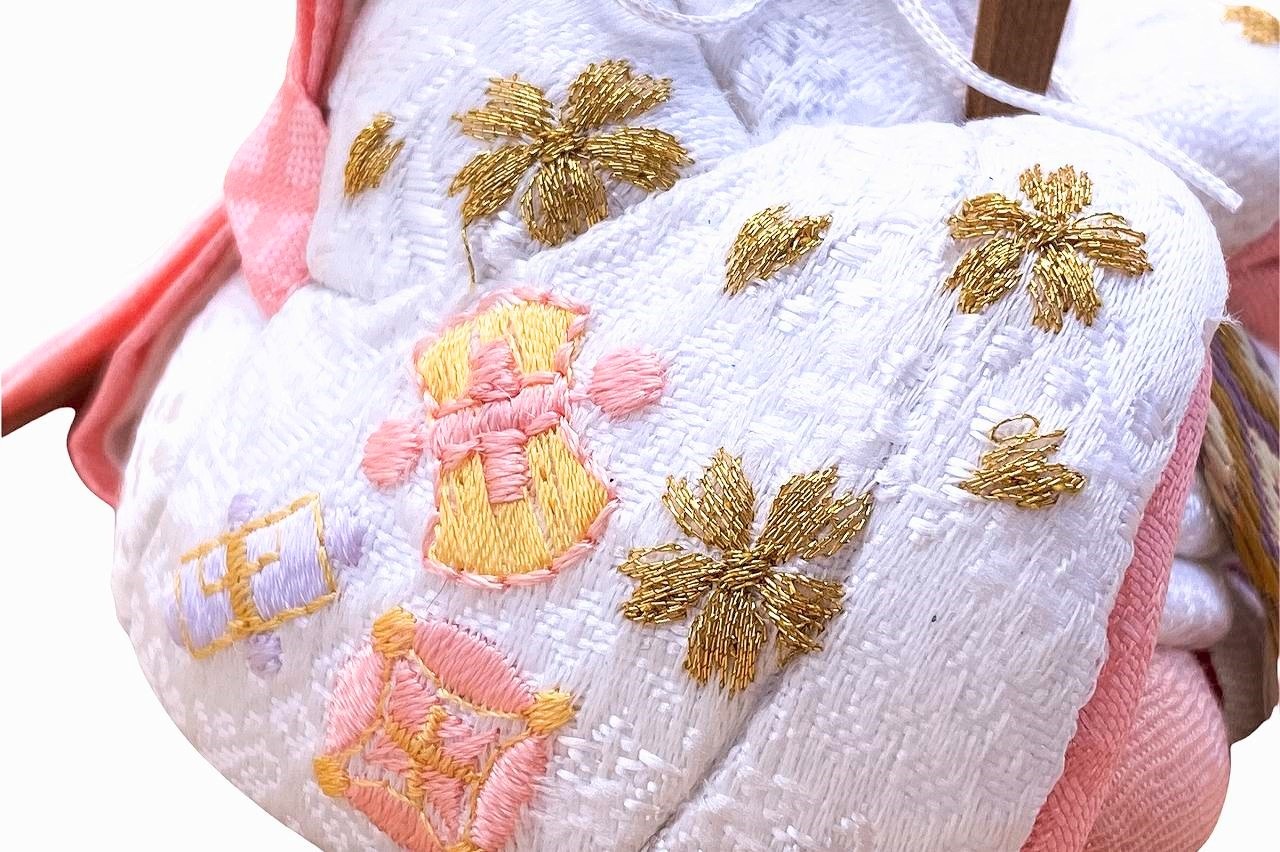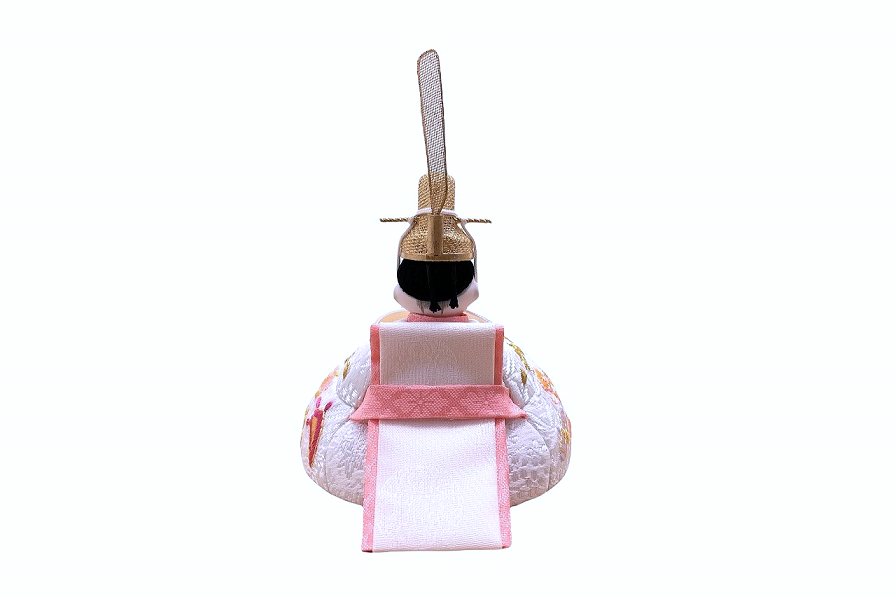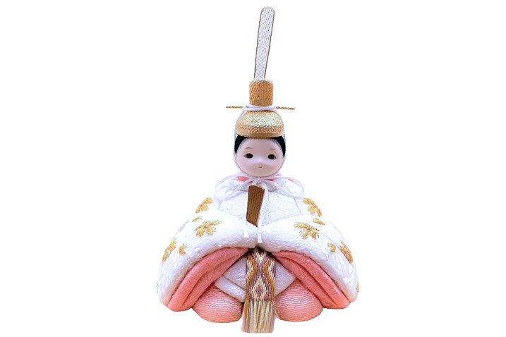 【インスタグラム掲載商品】インスタグラム掲載商品】小さな木目込み親王飾り雛人形 rico寧々(ねね)。白地に、おそろいのおめでたい宝尽くし模様を刺繍したお着物を着たお雛様です。