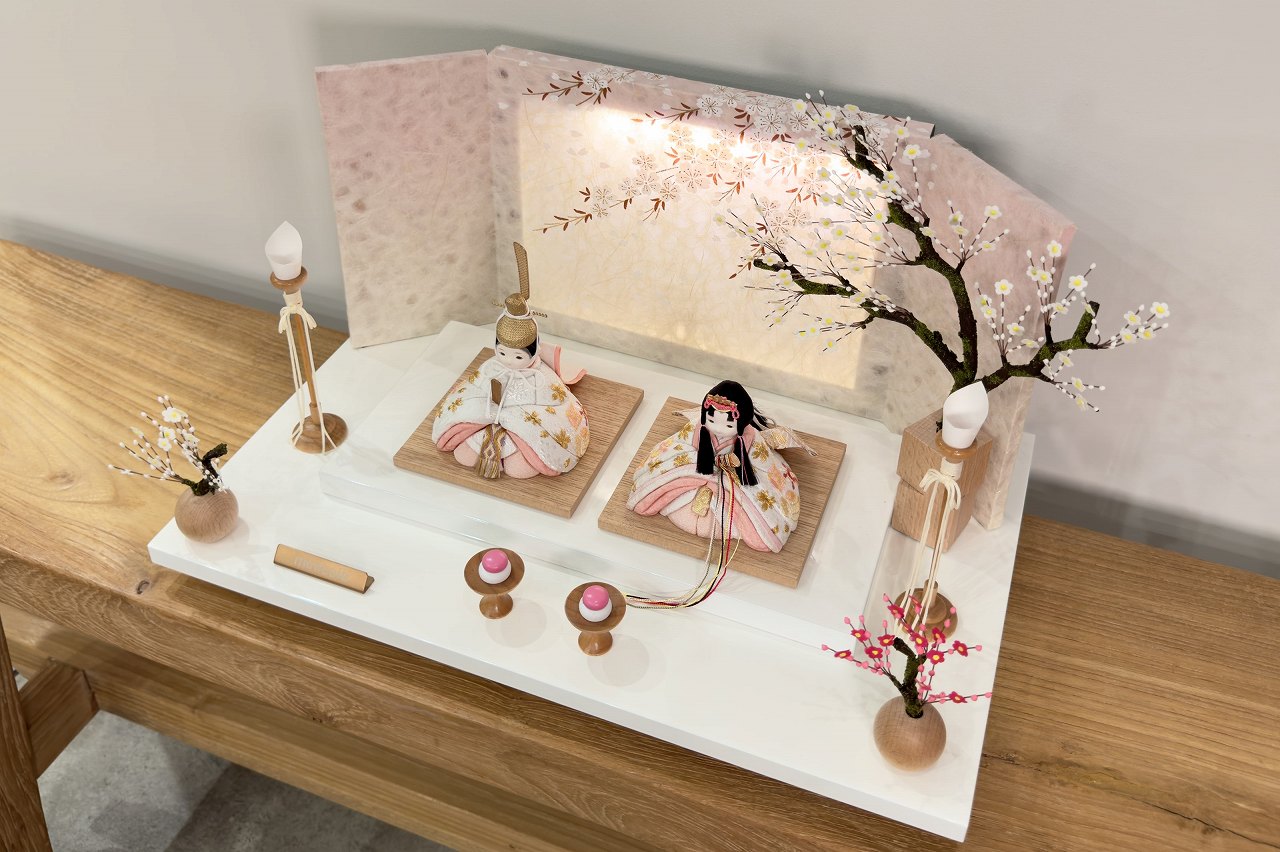 高岡塗ステップ白足付き台と、華やかなしだれ桜が描かれたLEDバックライト付き屏風のセットです。