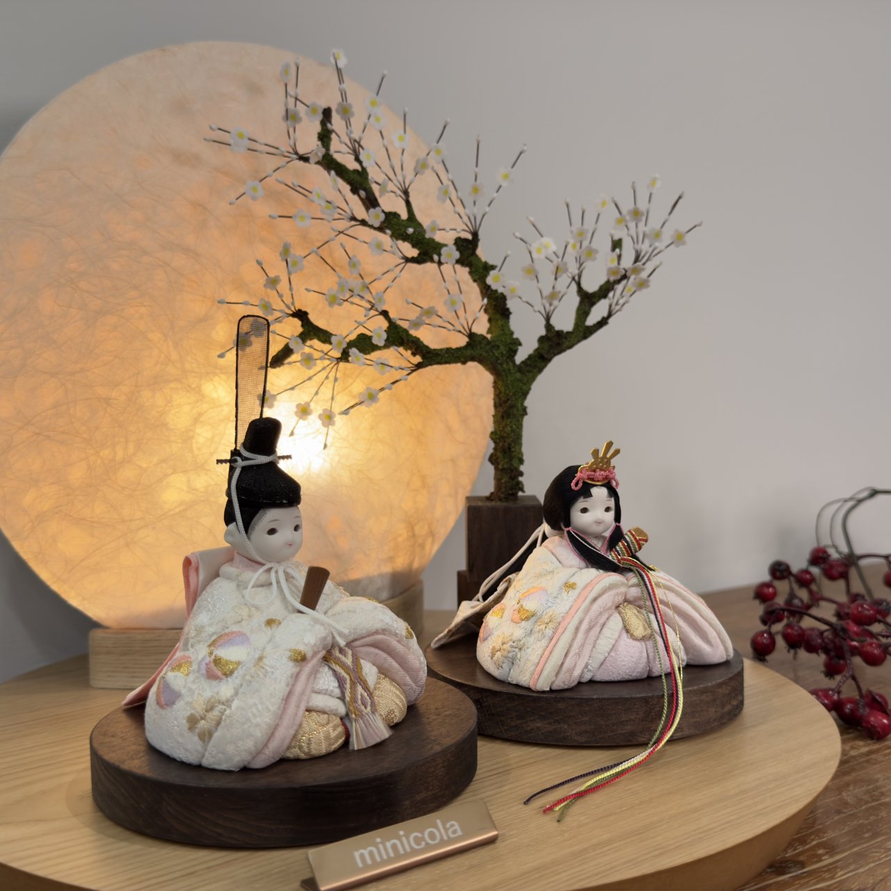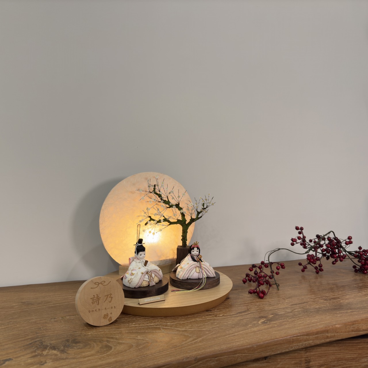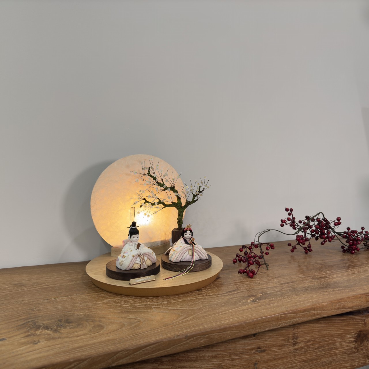 おしゃれでお顔がかわいい雛人形として、和室はもちろんリビングにもピッタリです。丸木台(天然の突板材)を使用した伝統美と現代デザインのコラボレーションが、一層の上品さを演出します。