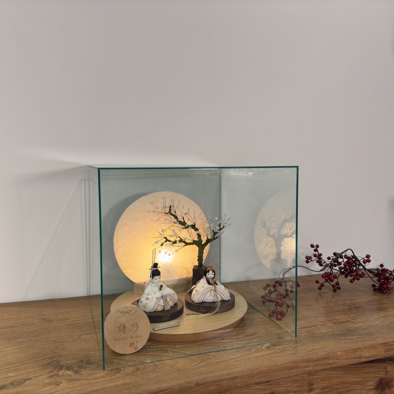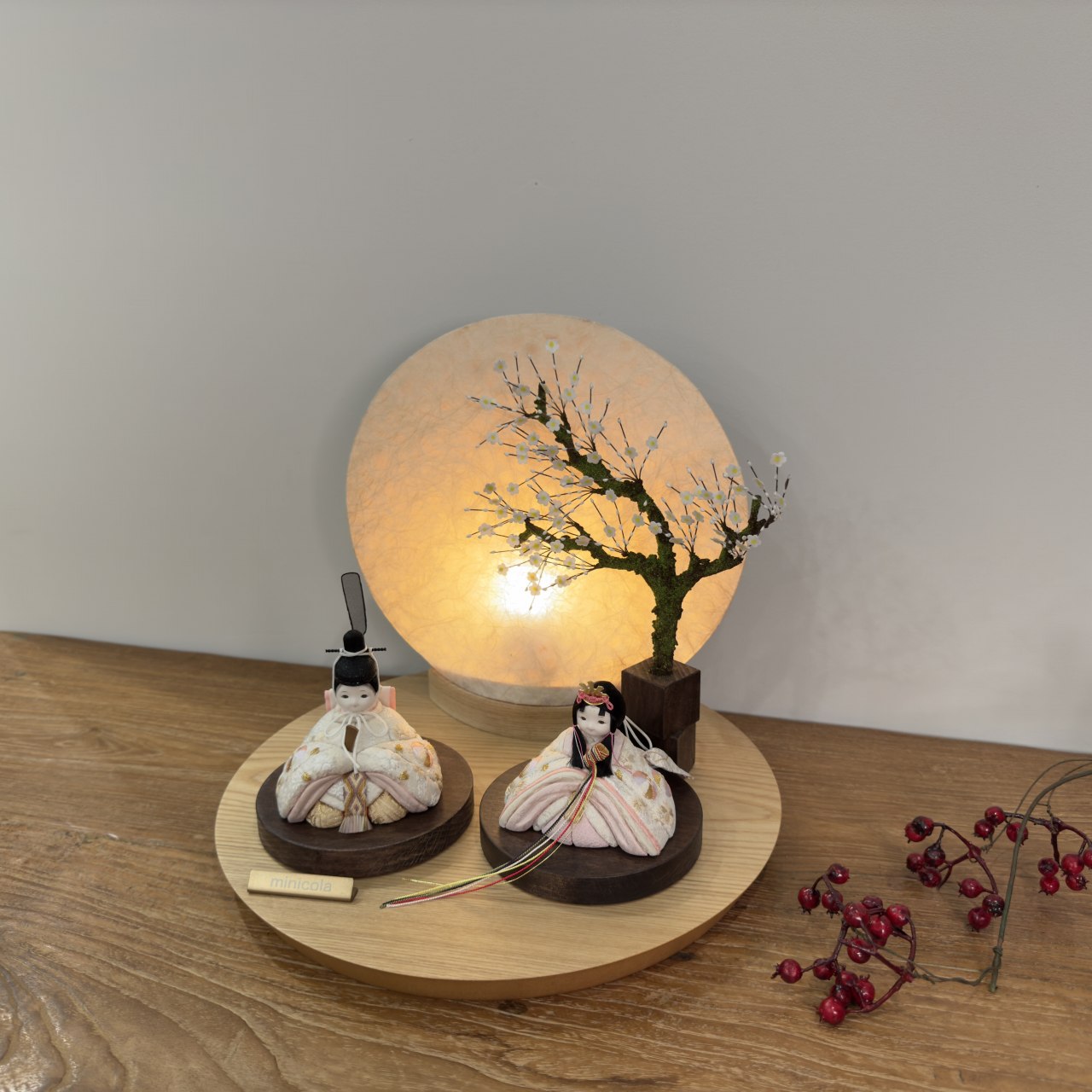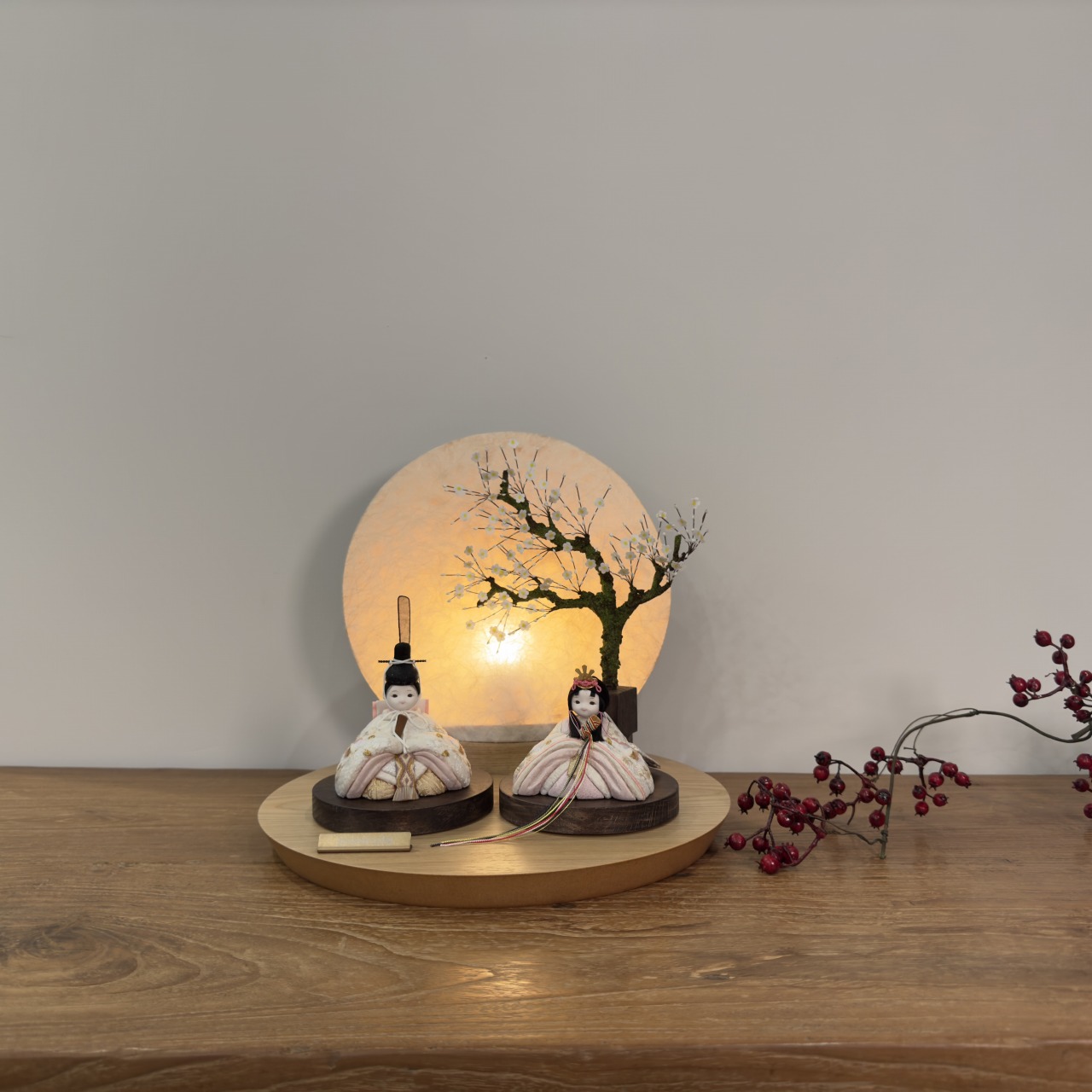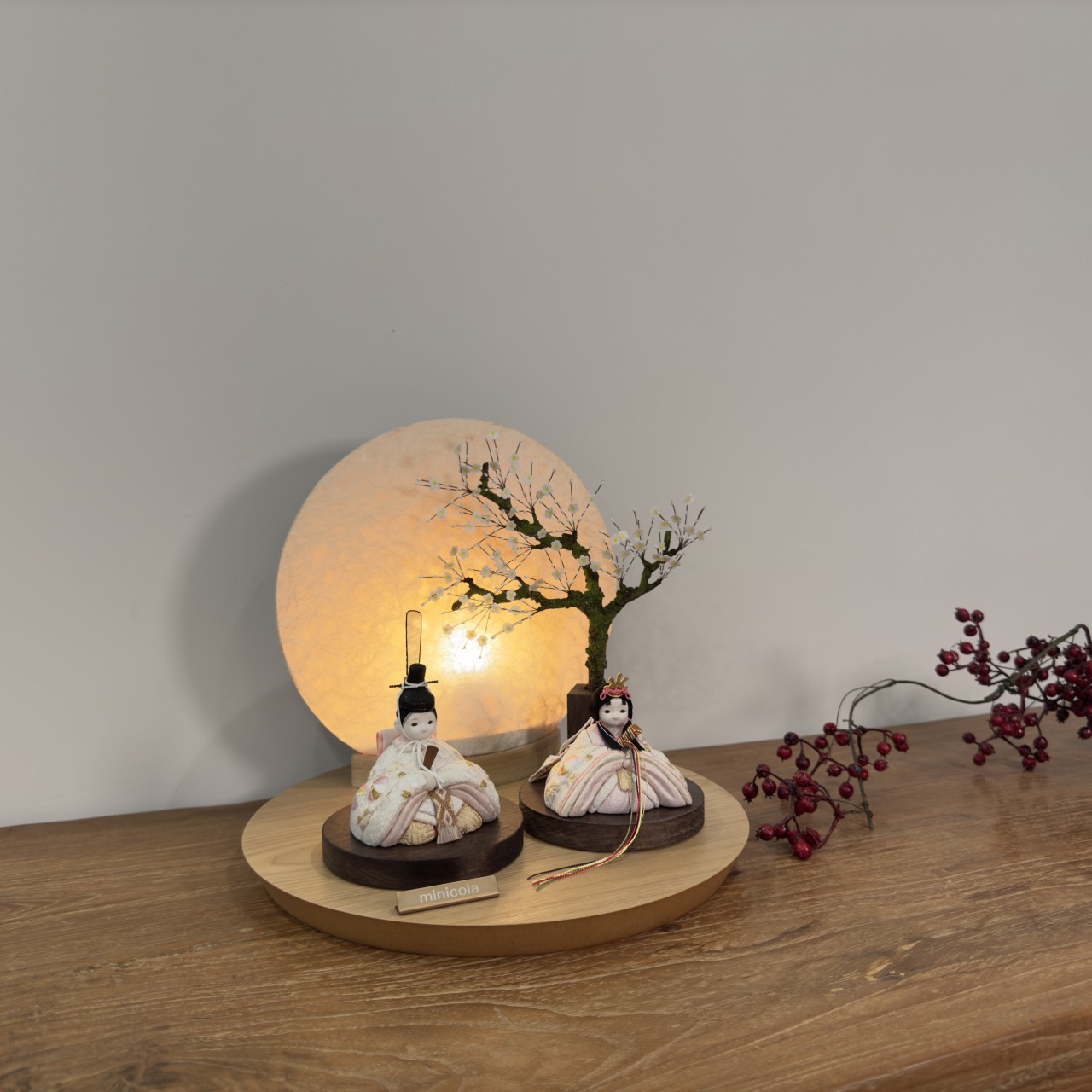 おしゃれでお顔がかわいい雛人形として、和室はもちろんリビングにもピッタリです。丸木台(天然の突板材)を使用した伝統美と現代デザインのコラボレーションが、一層の上品さを演出します。