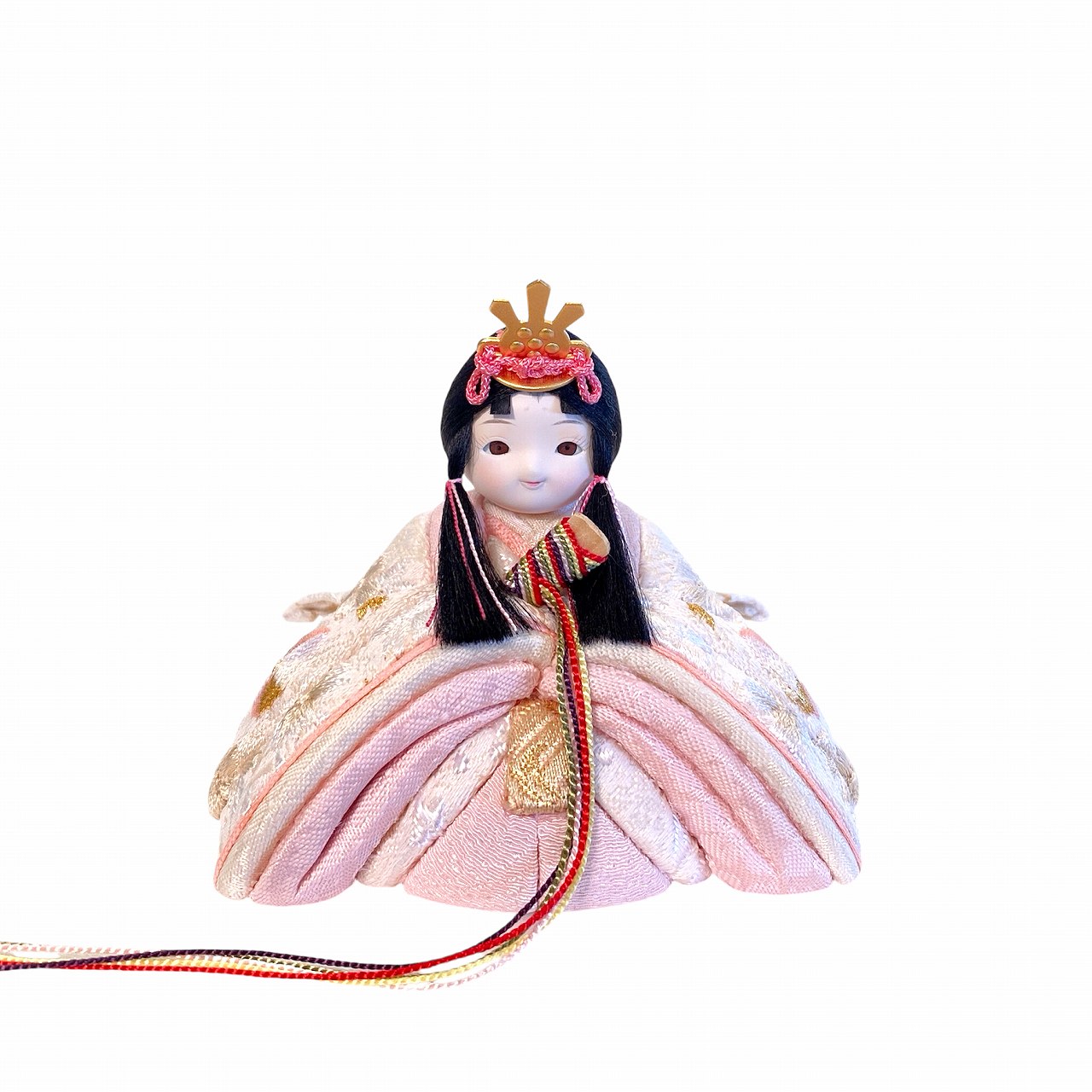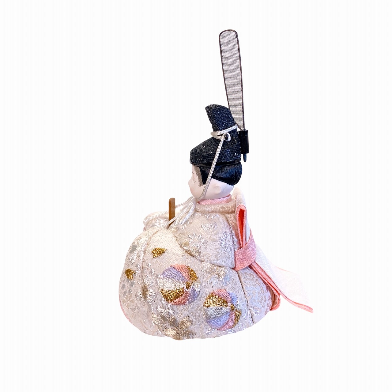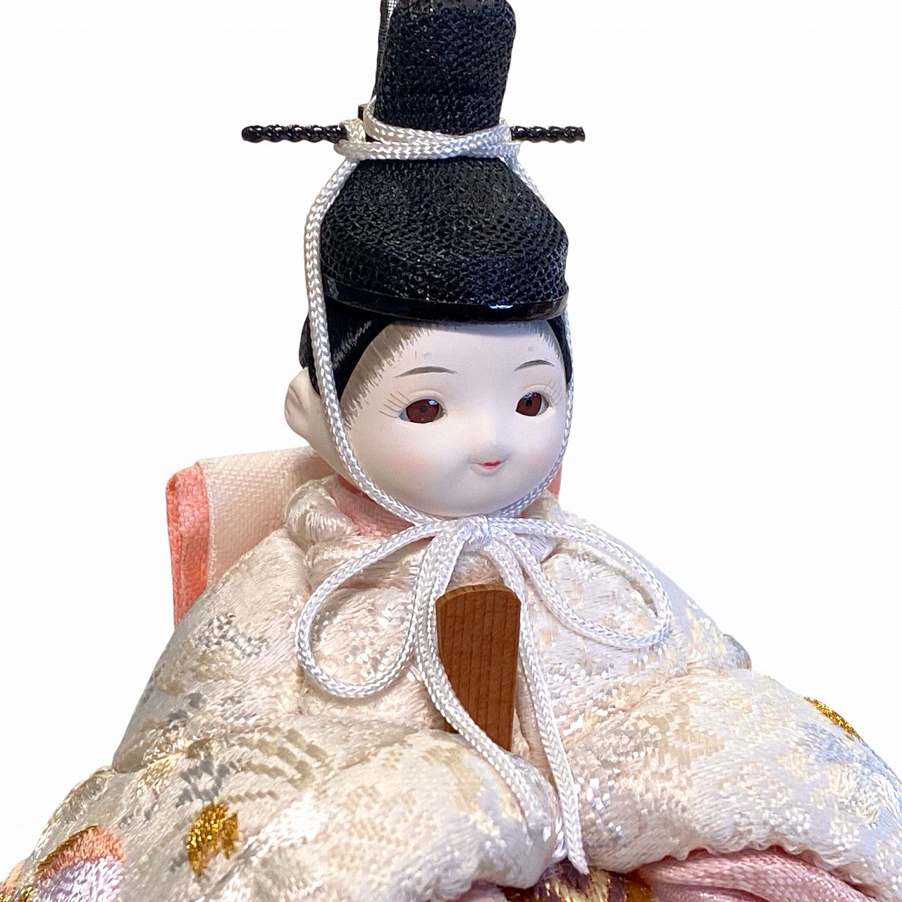 【インスタグラム掲載商品】小さな木目込み親王飾り雛人形 rico結愛(ゆあ)。桜と鞠の模様が刺繍された、淡く優しい色あいのお着物を着たお雛様です。