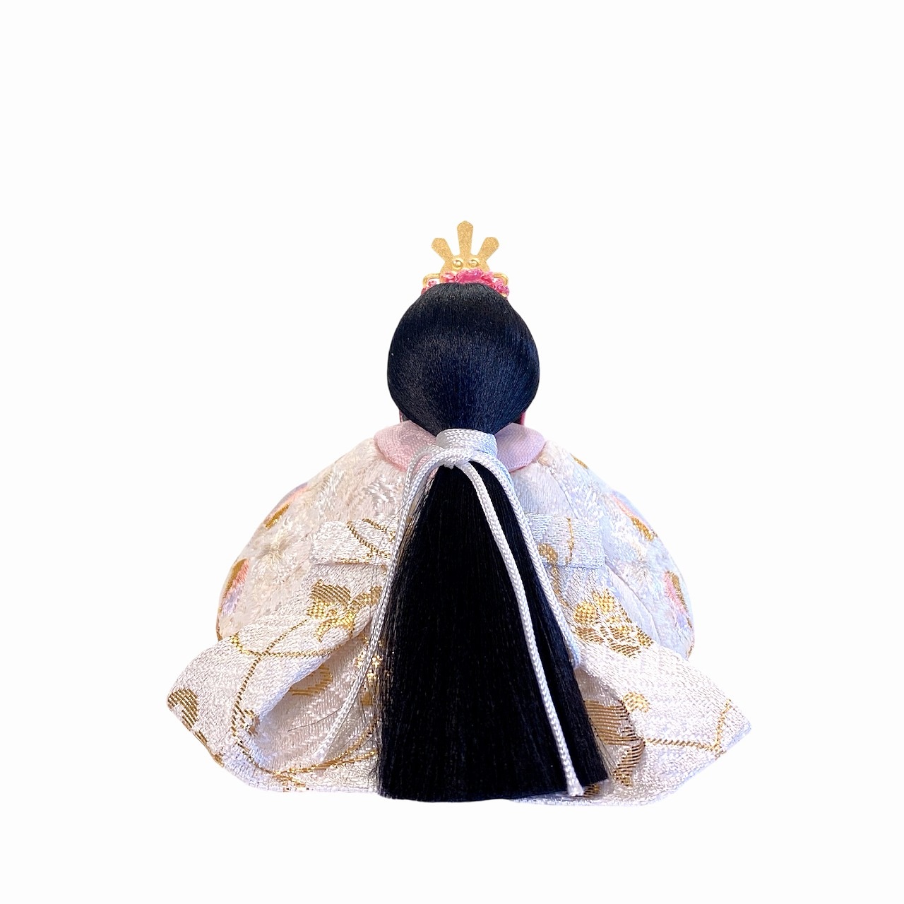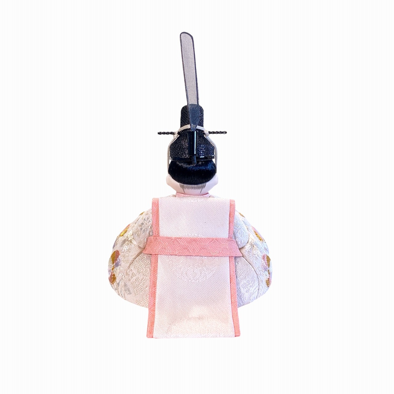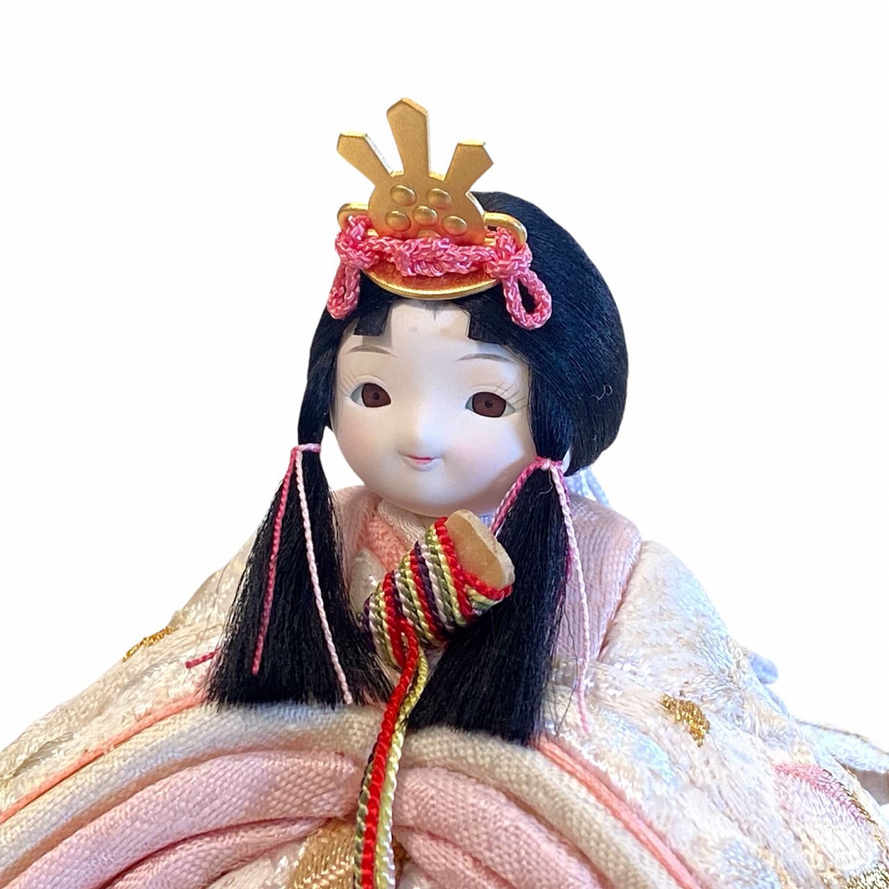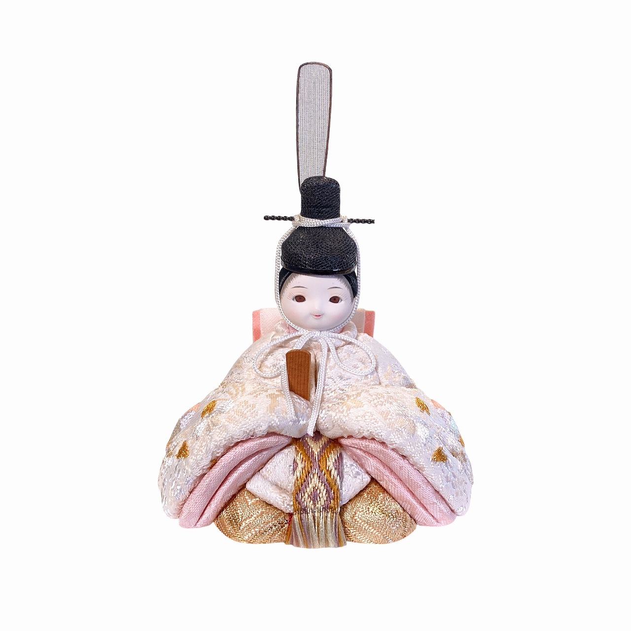 【インスタグラム掲載商品】小さな木目込み親王飾り雛人形 rico結愛(ゆあ)。桜と鞠の模様が刺繍された、淡く優しい色あいのお着物を着たお雛様です。