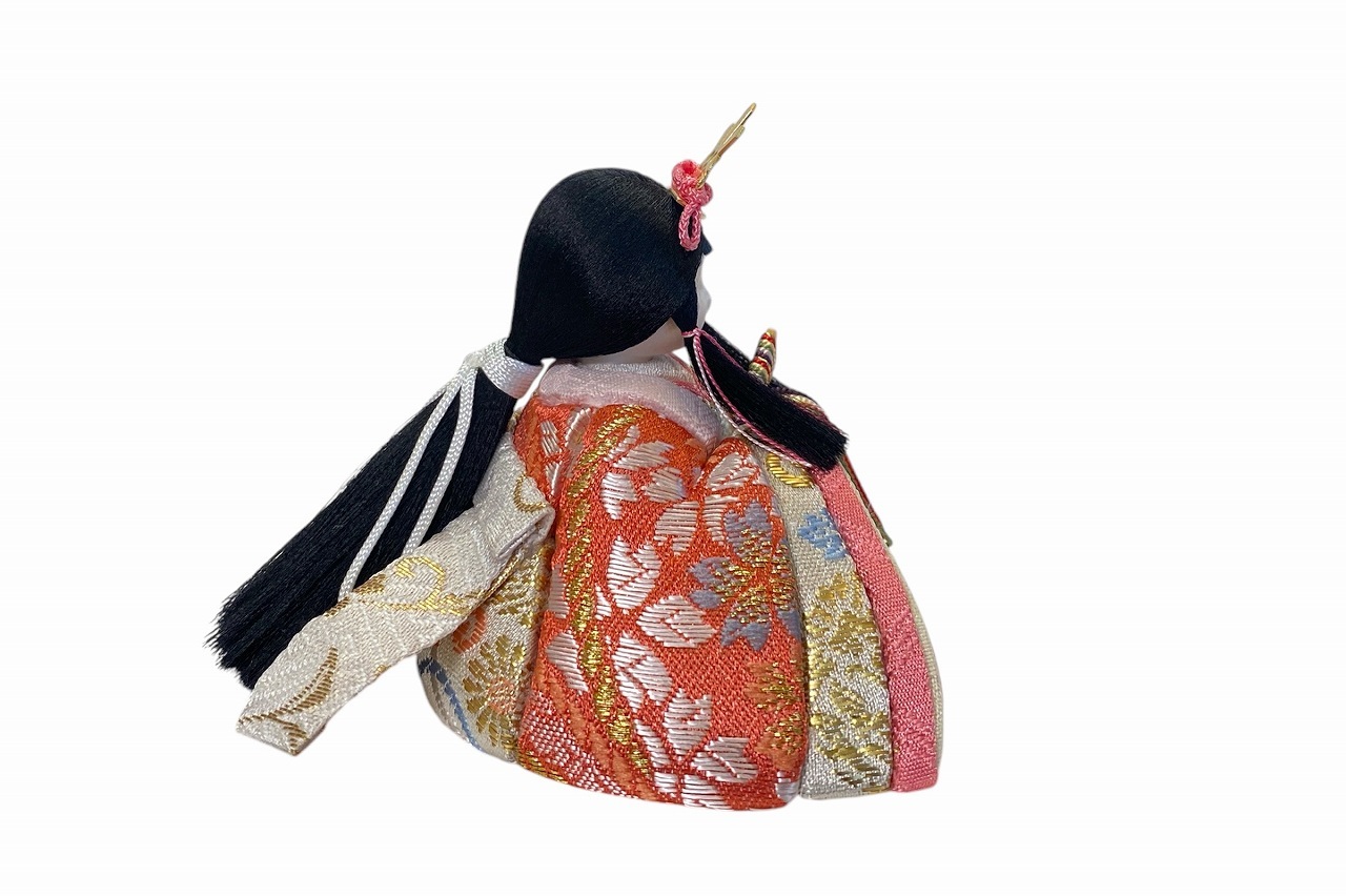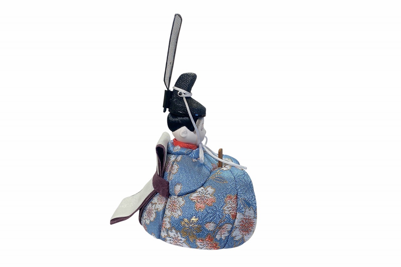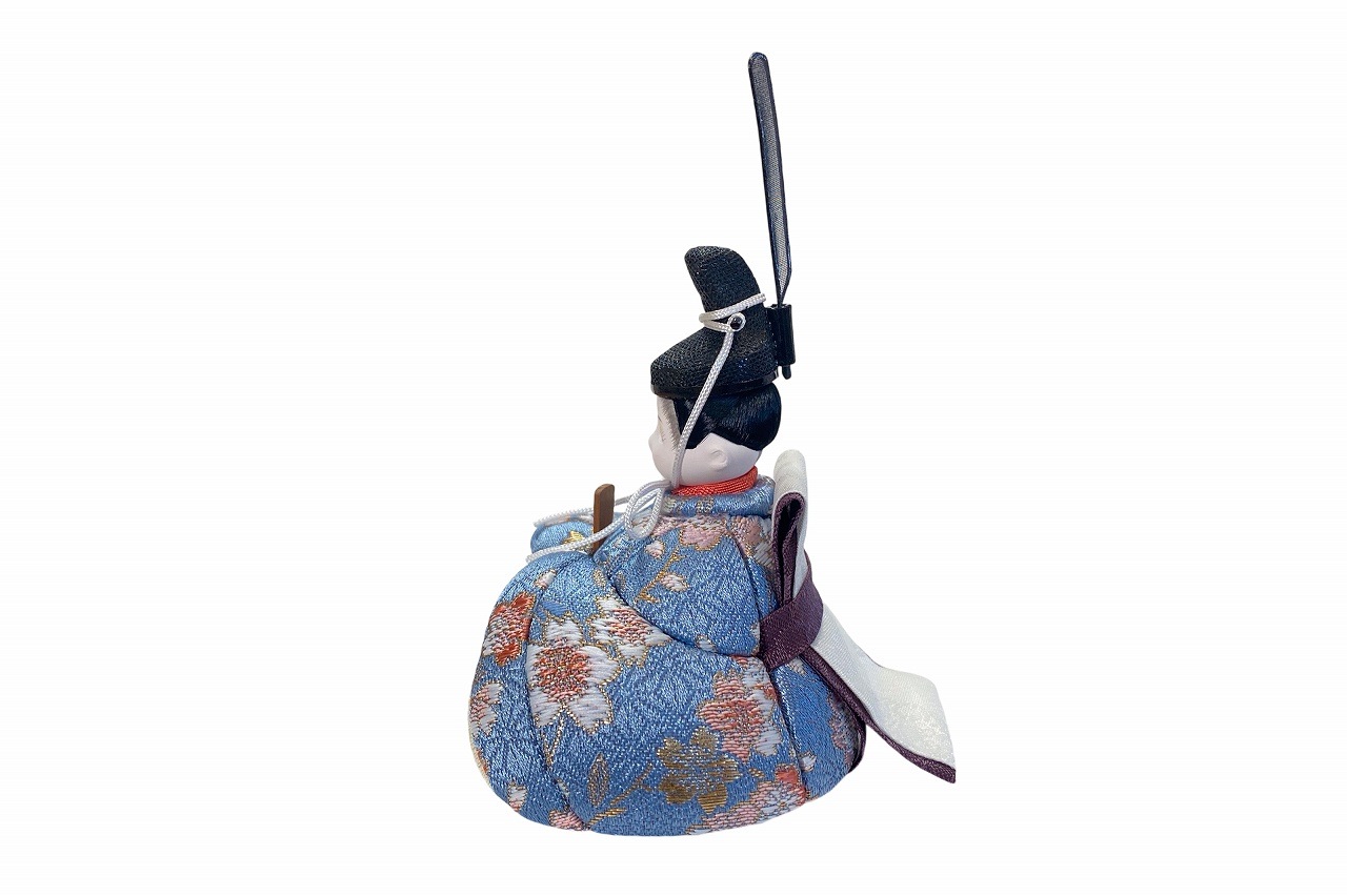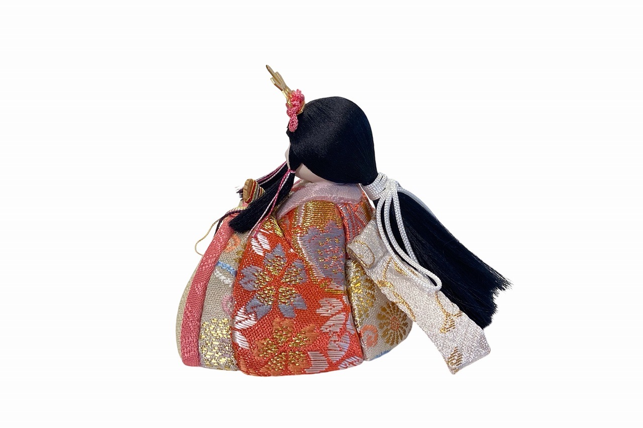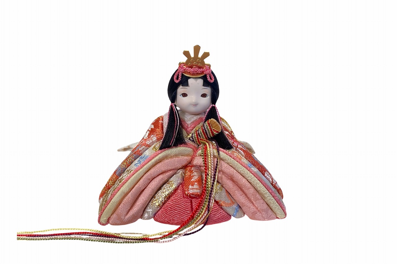 小さな木目込み親王飾り雛人形。rico美琴(みこと)桜の花びらの柄で、人気の色味のお着物を着たお雛様です。