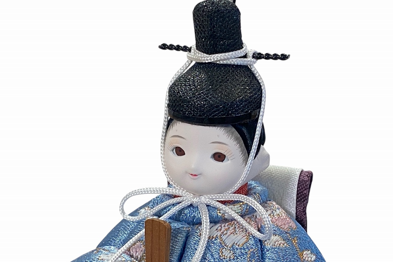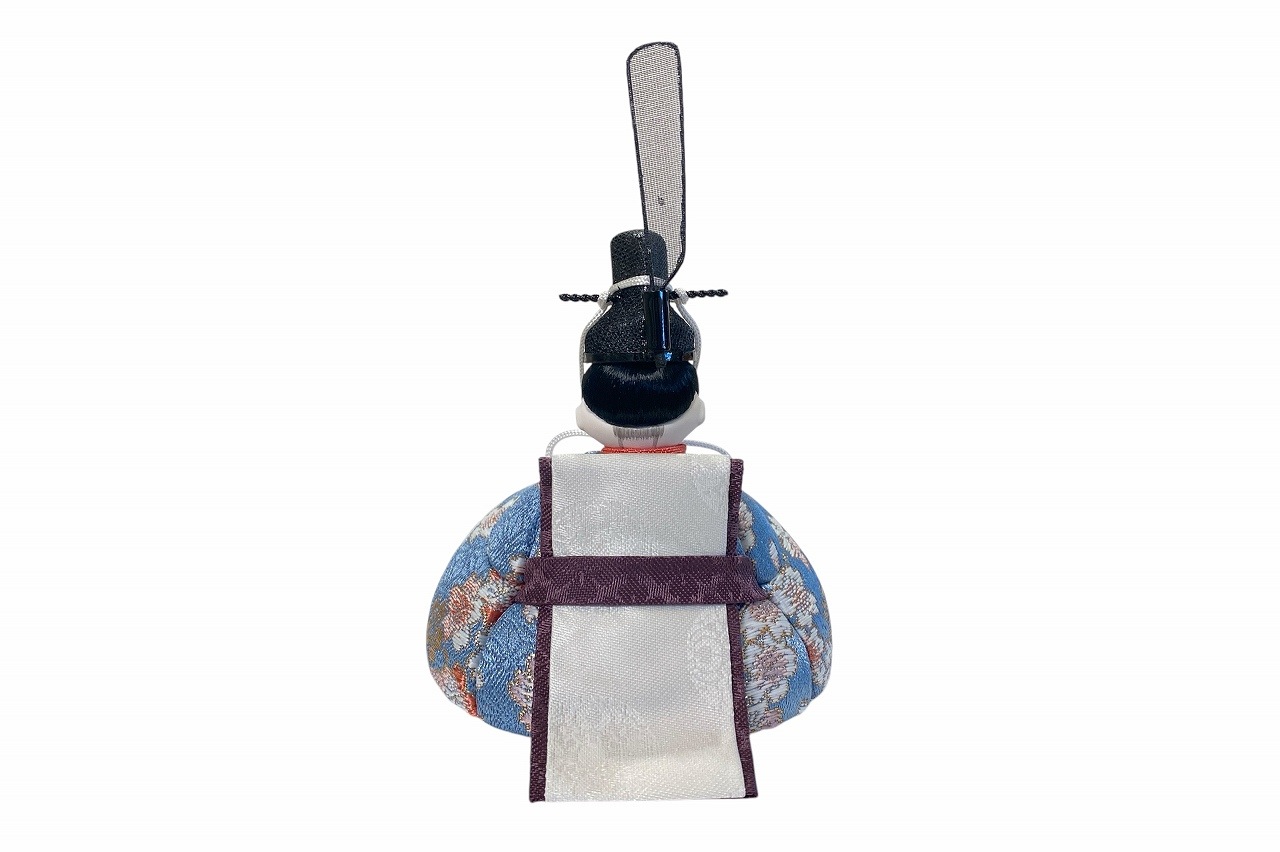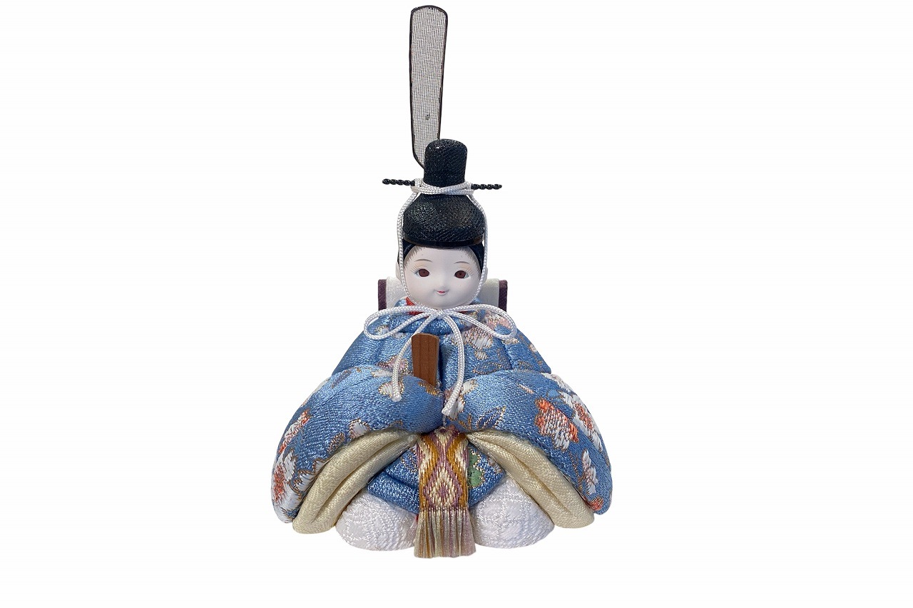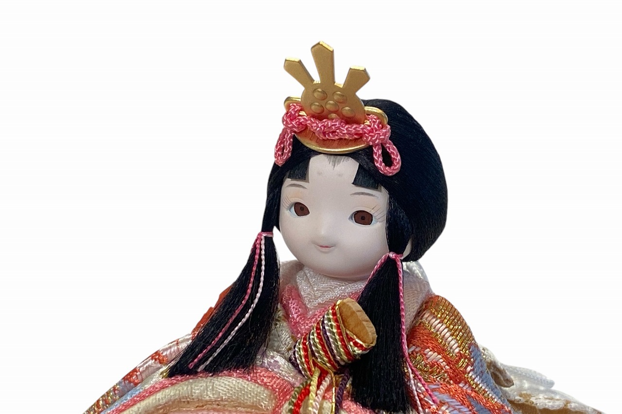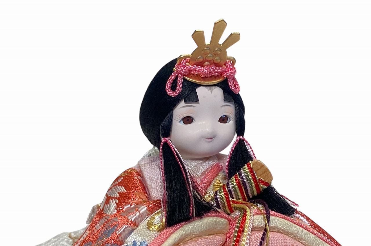 小さな木目込み親王飾り雛人形。rico美琴(みこと)桜の花びらの柄で、人気の色味のお着物を着たお雛様です。
