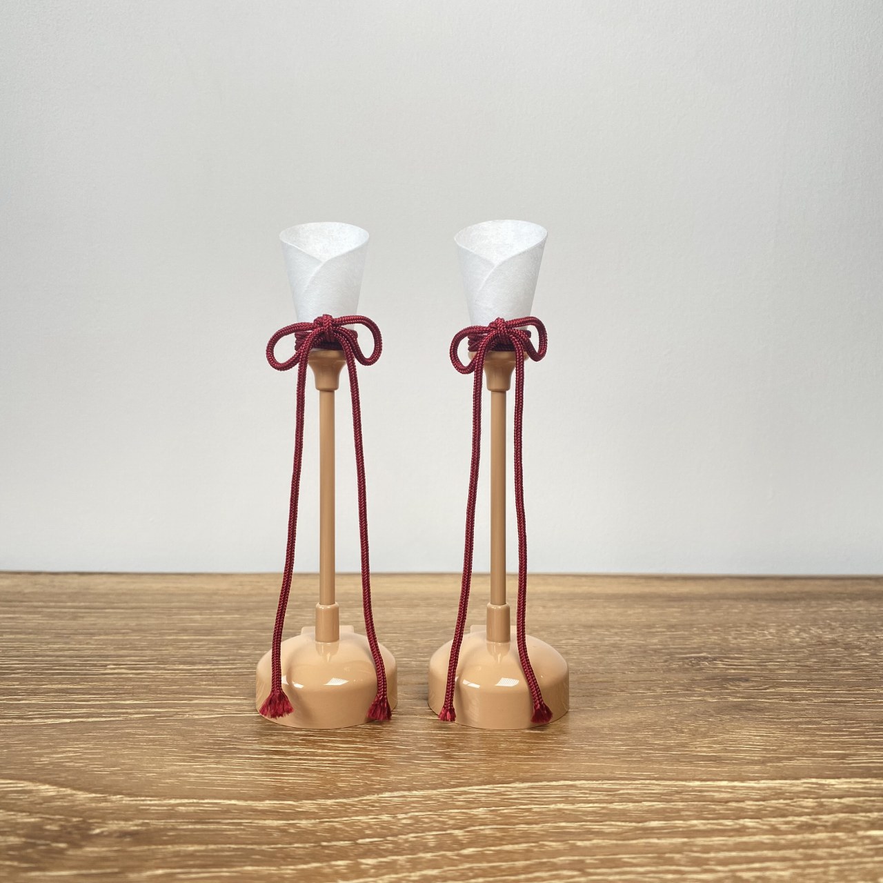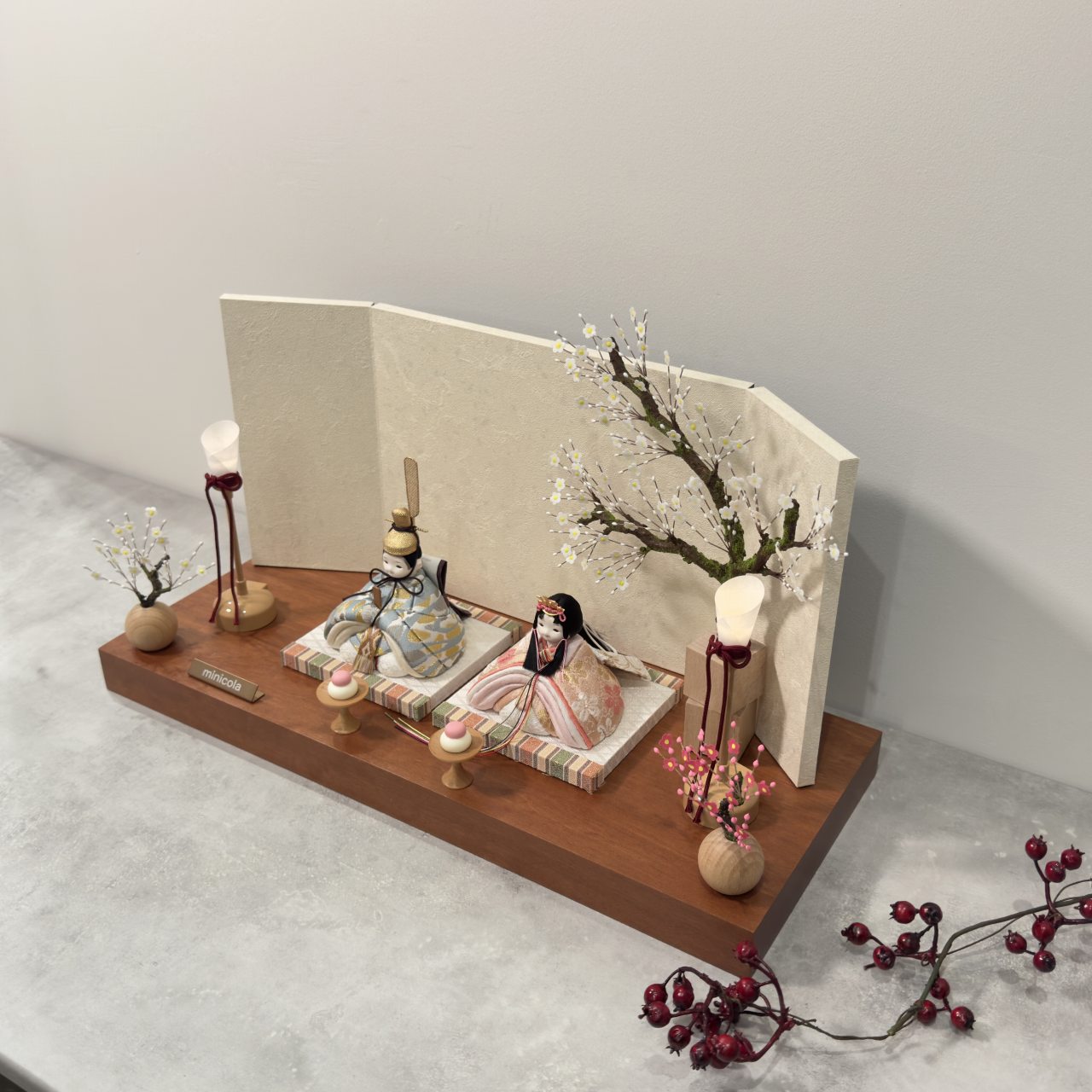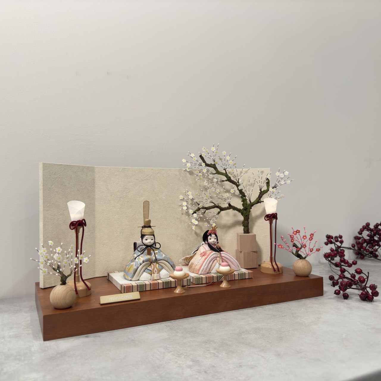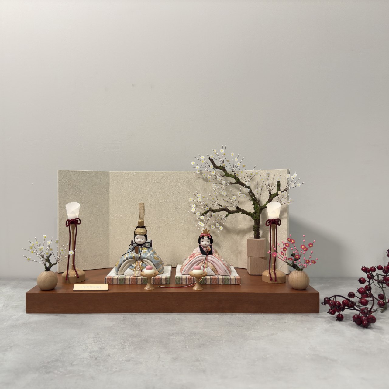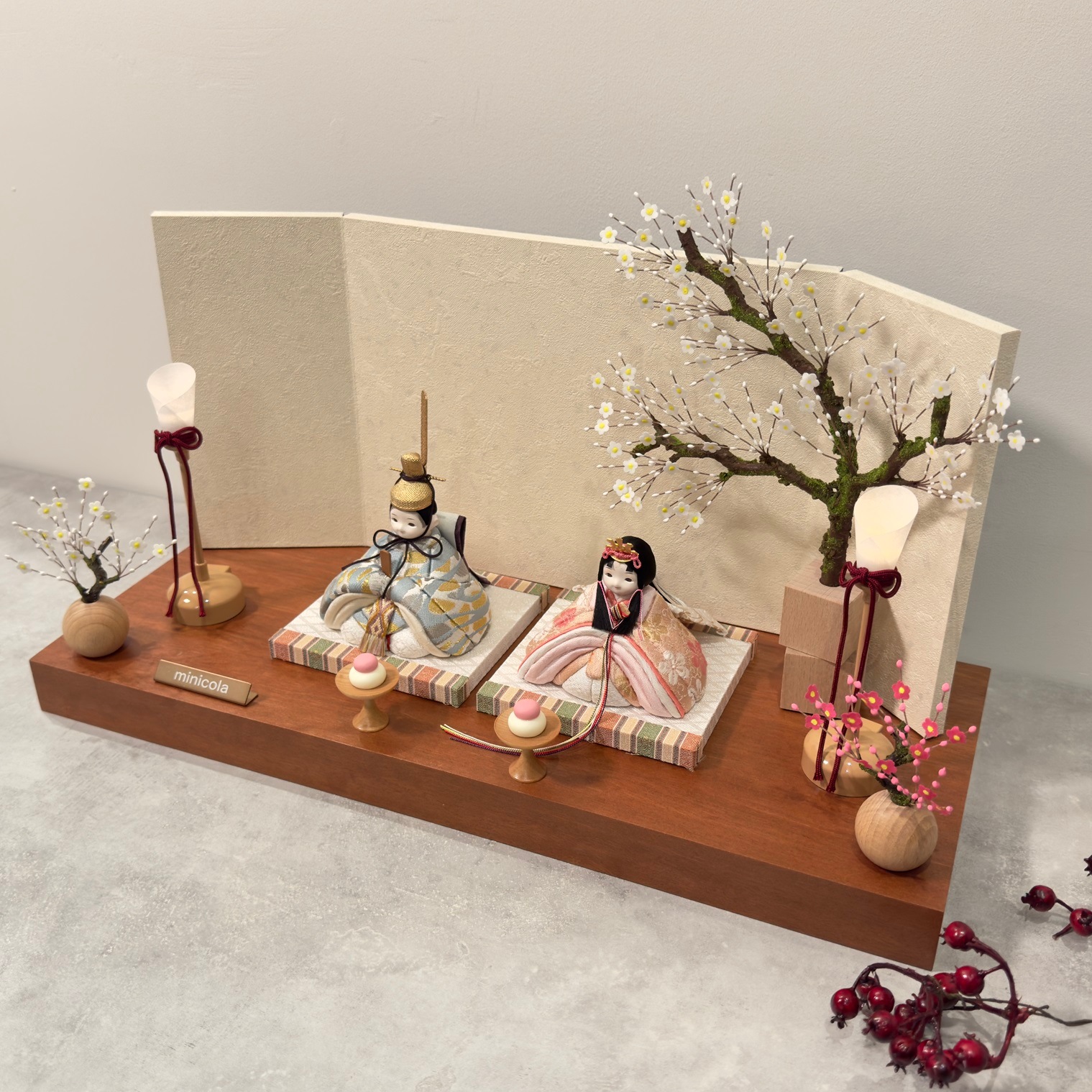 飾り台は、高級木材として知られる無垢材のモアビを使用し、月の雫屏風と白梅キューブ合わせた、シンプルながらも伝統とモダンが美しく融合したセットです。