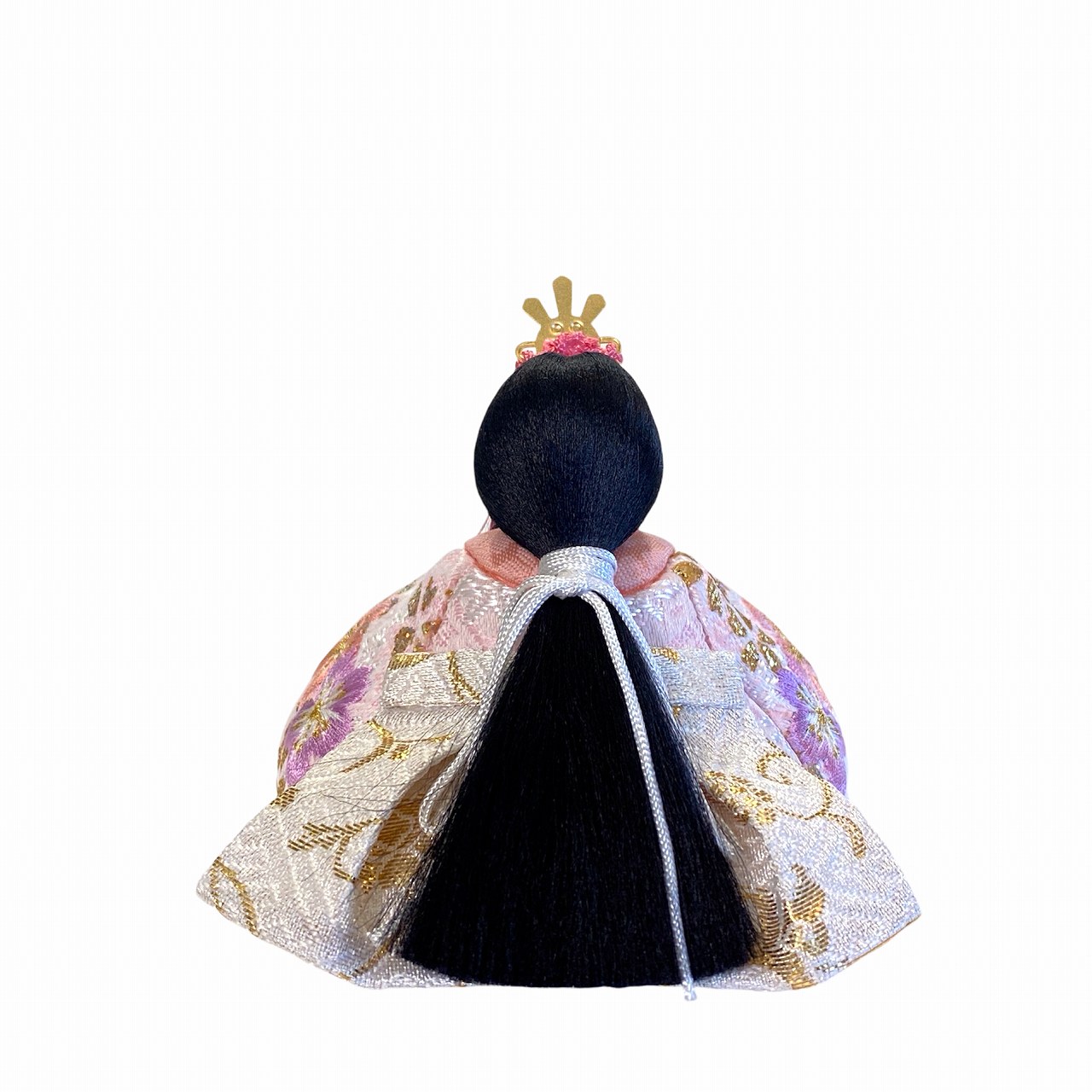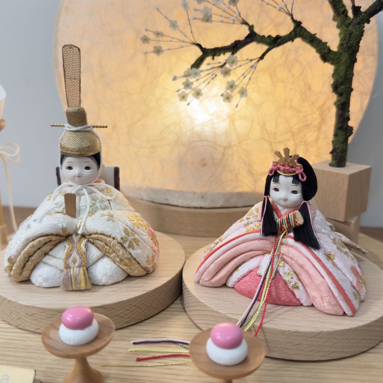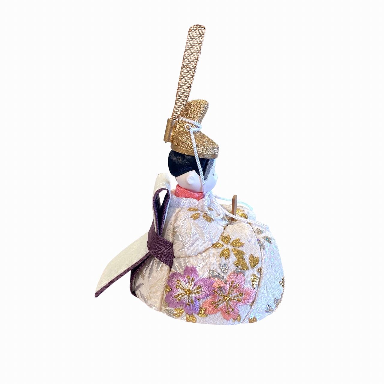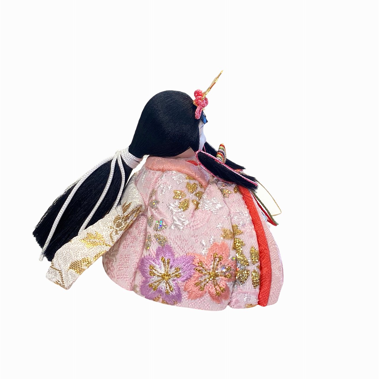 【インスタグラム掲載商品(リール)】小さな木目込み親王飾り雛人形 rico美優(みゆ)。キラキラした桜の花びら模様と、桜の刺繍をほどこしたお着物を着たお雛様です。