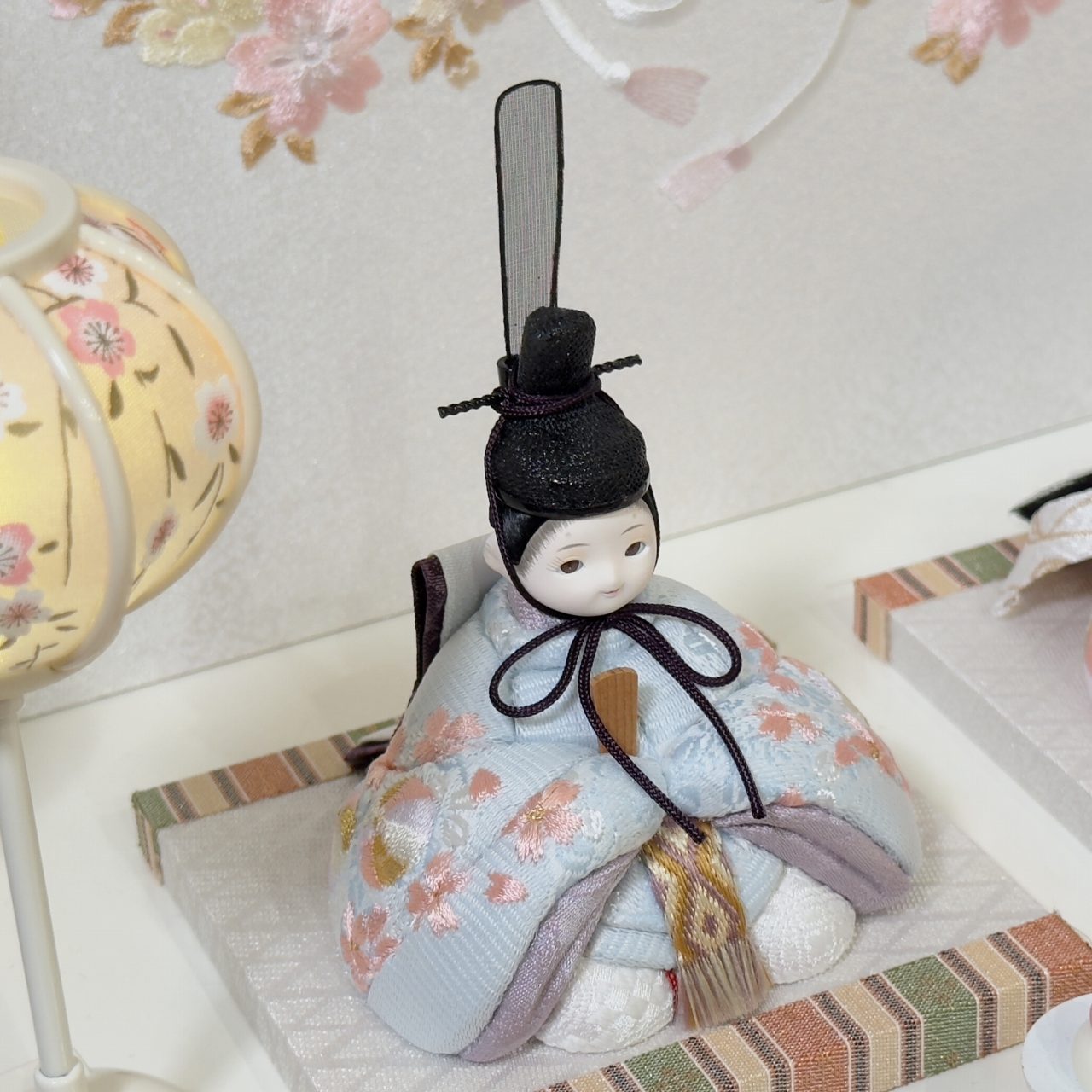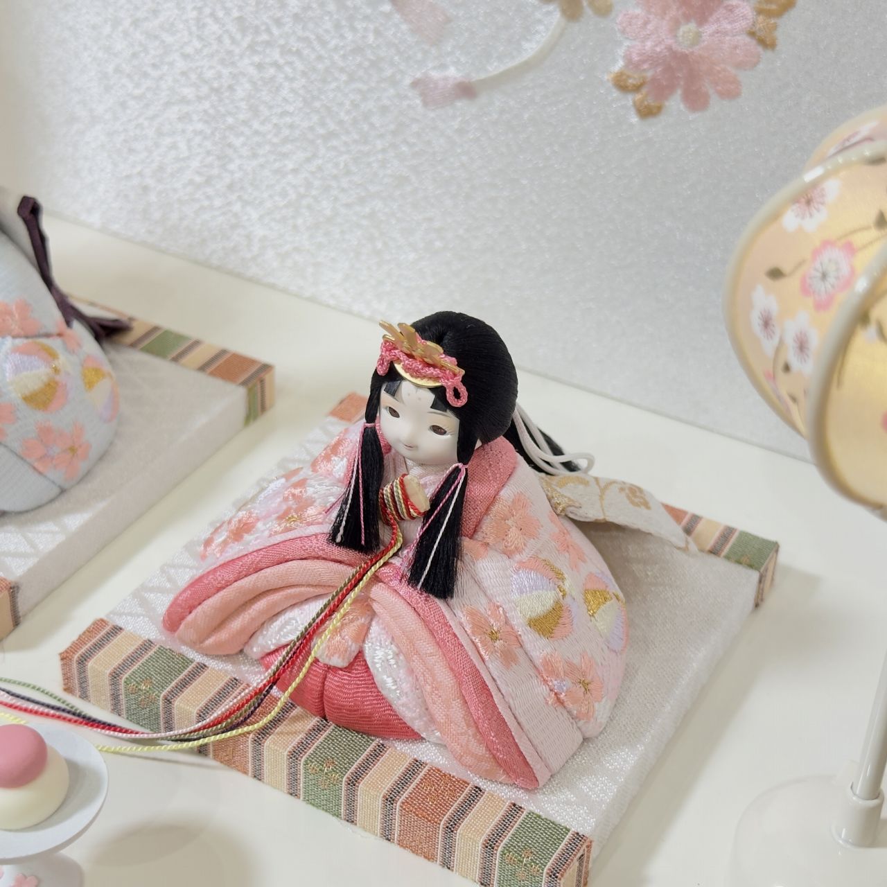 白地に桜リボンを刺繍したお屏風と合わせたセットは、春の訪れを感じさせるような優しい色合いの組み合わせです。