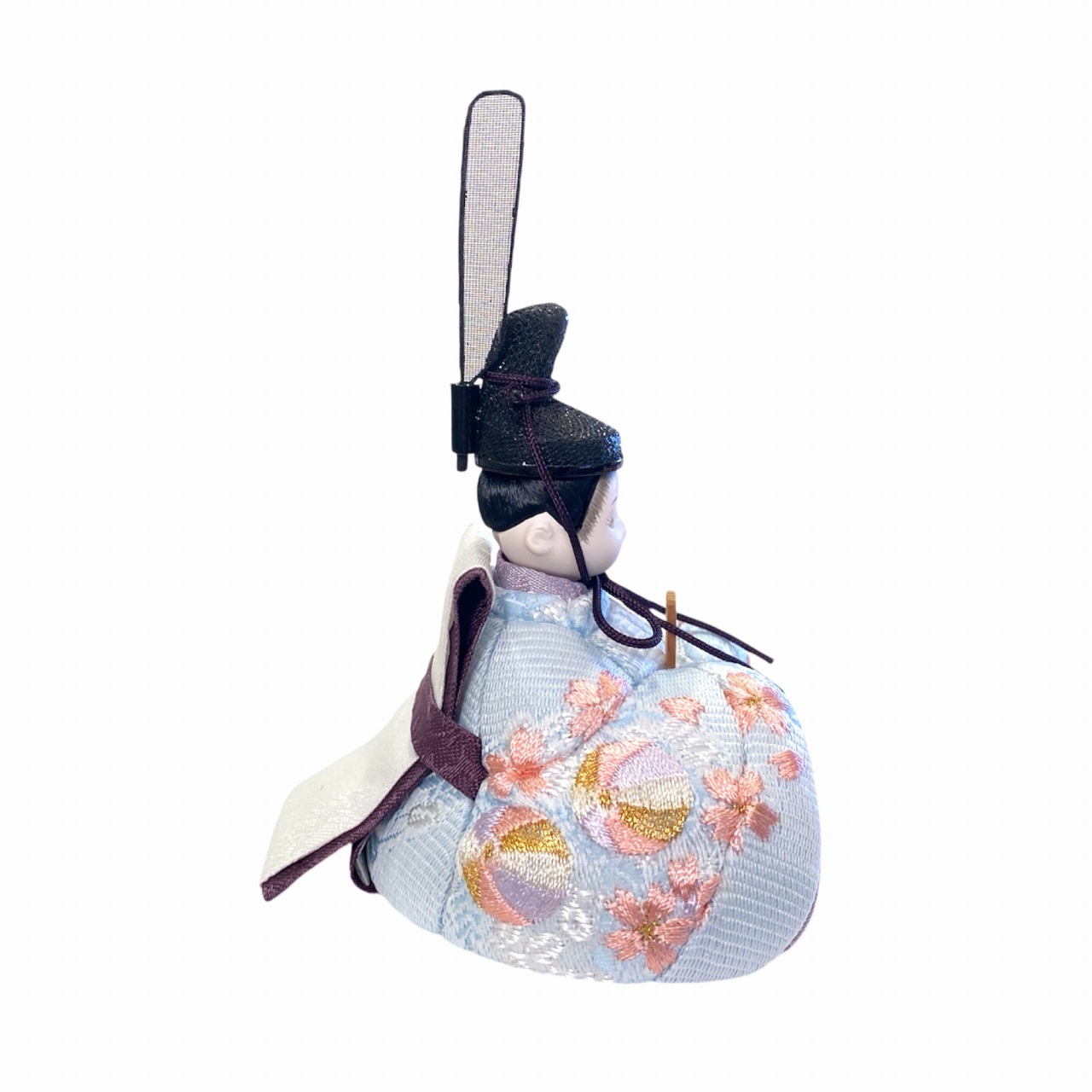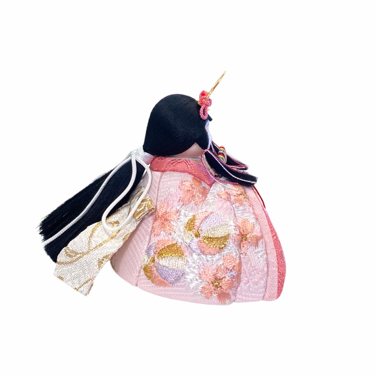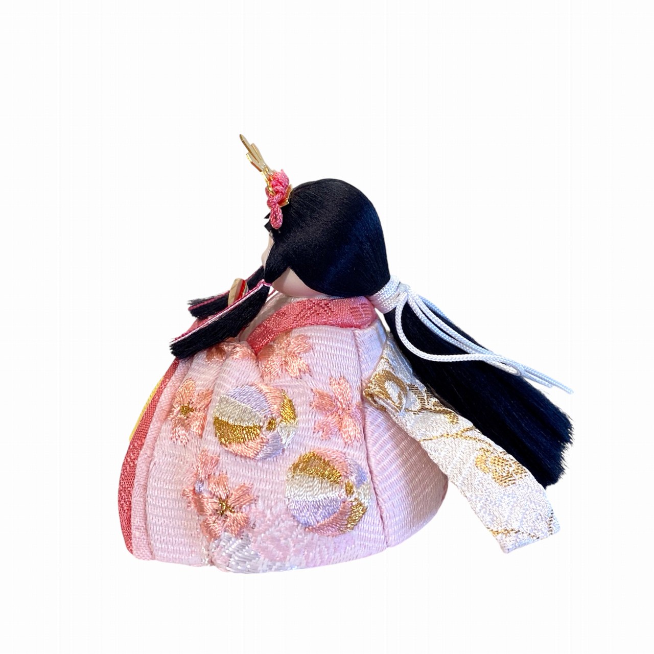 【インスタグラム掲載商品】小さな木目込み親王飾り雛人形。rico沙羅(さら)おそろいの桜と鞠の刺繍のお着物を着たお雛様です。鞠は長い糸で作られていることから「縁を結ぶ」「良縁に恵まれる」と考えられ、丸い形は「円満」「物事が丸く収まる」縁起のよい絵柄として古来より用いられてきました。 高岡塗の台は、上面が白、前面が淡いピンク色に塗分けられ、伝統文化を大切にしながらも、現代的な要素を取り入れたデザインです。