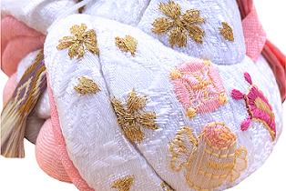小さな木目込み親王飾り雛人形 rico寧々(ねね)。白地に、おそろいのおめでたい宝尽くし模様を刺繍したお着物を着たお雛様です。