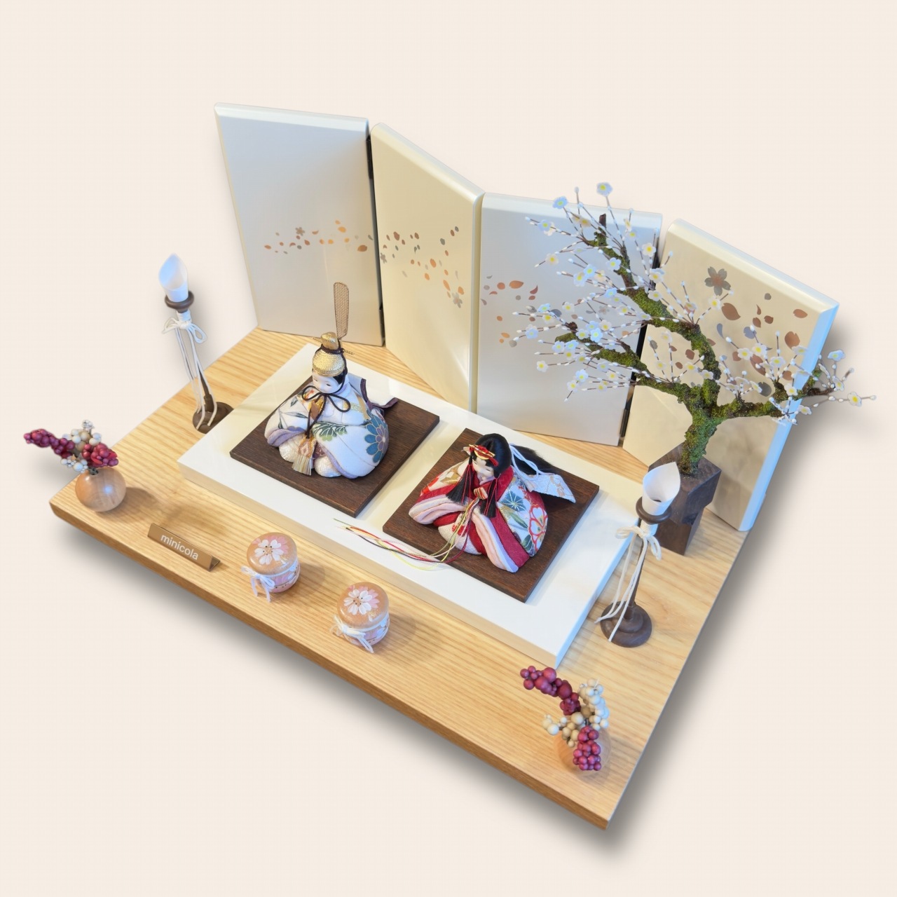 ナチュラルな木台に高岡塗りの白台を合わせた飾り台と、金銀の花びら模様の蒔絵がほどこされた高岡塗ミルキー屏風の組み合わせは、お部屋を華やかに彩り、周囲の空間を一層明るく引き立てます。