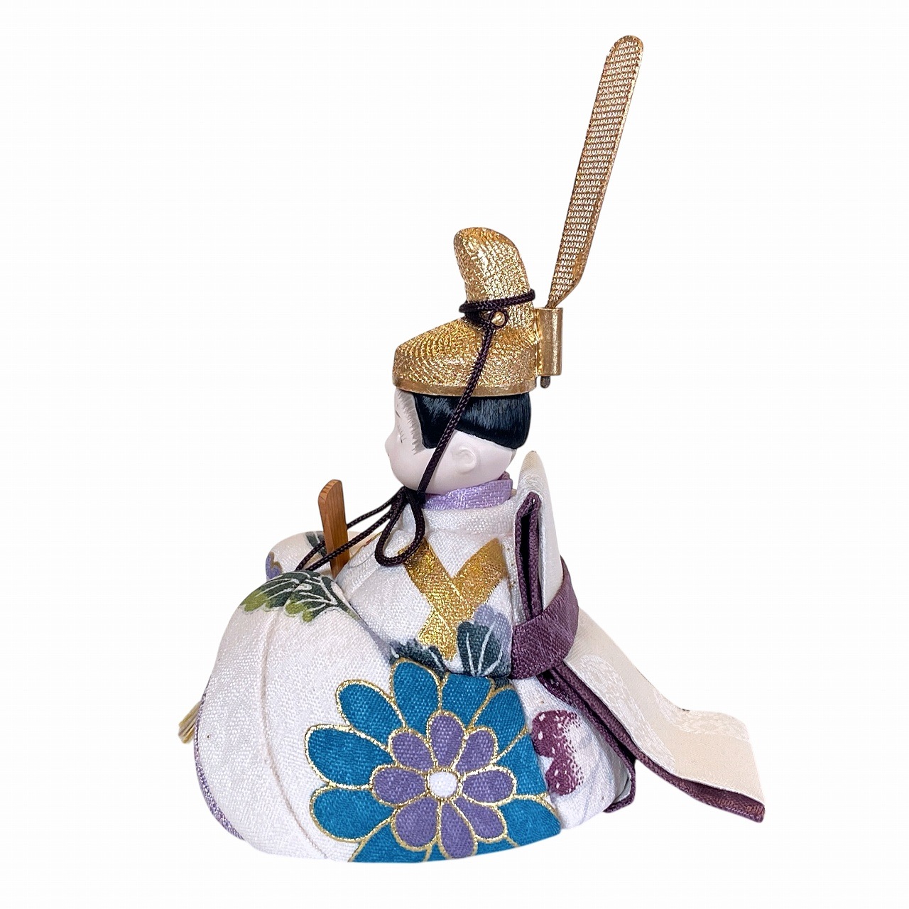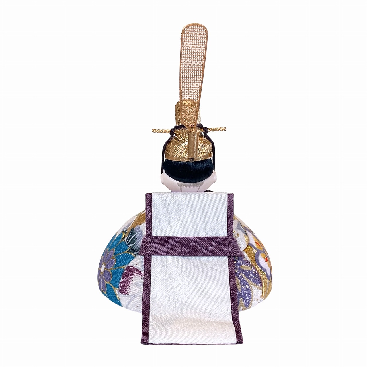 【インスタグラム掲載商品】小さな木目込み親王飾り雛人形。rico美月(みづき)白地にあざやかな季節の草花模様を華やかに表した、共柄のお着物です。(人形ごとに柄の出方が異なります。)