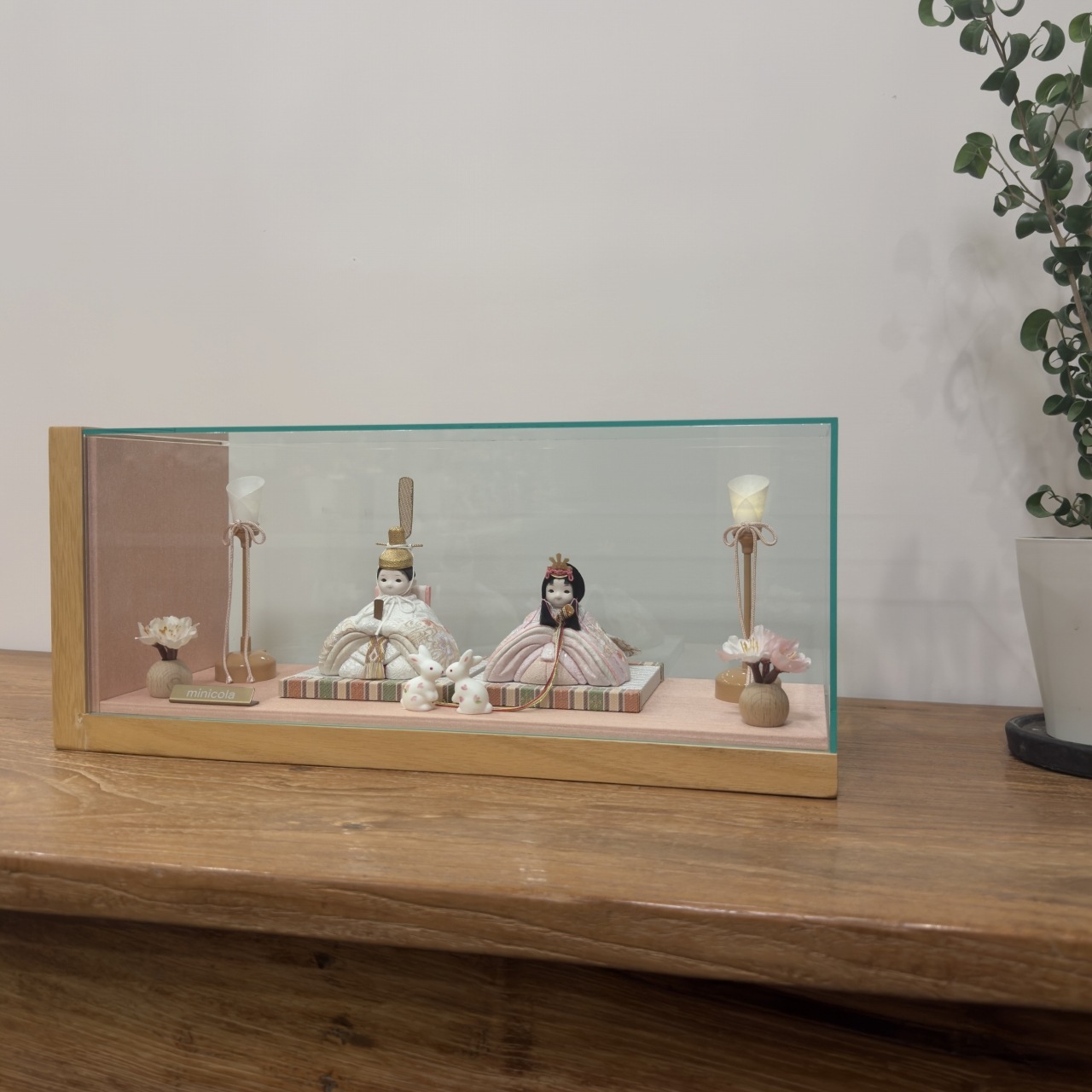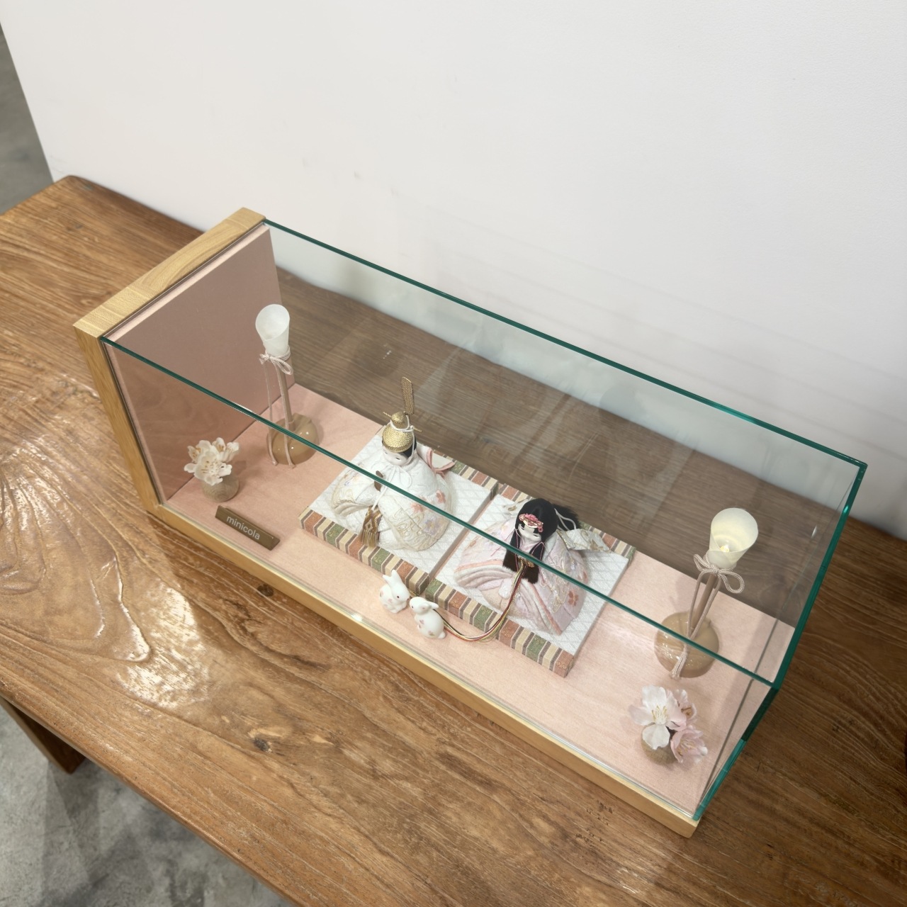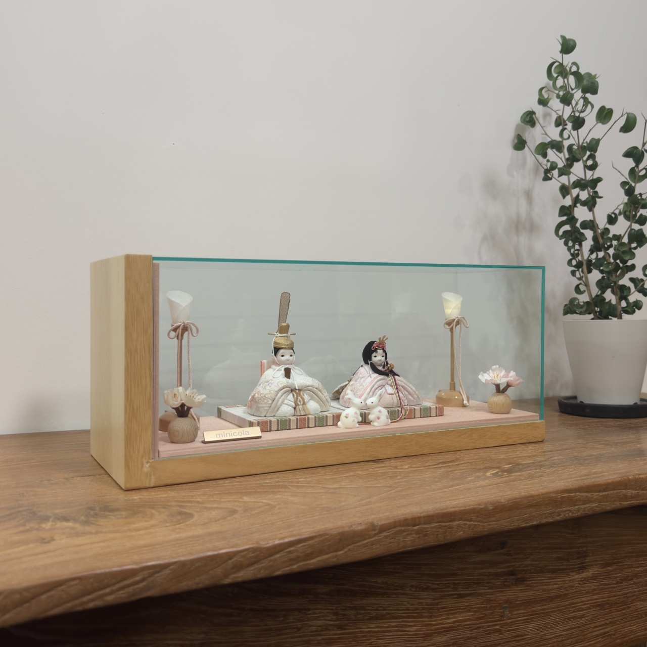 すっきりとデザインされた木台に、アクリルケースを合わせた、モダンでぱっと目を引くセットです。