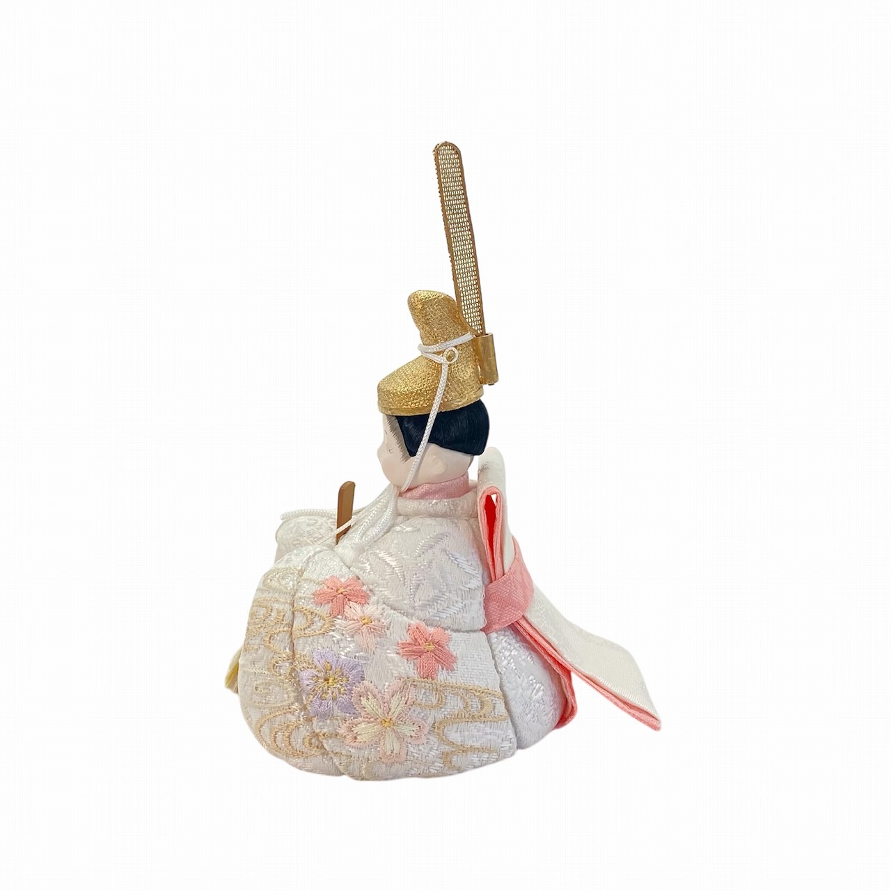 【インスタグラム掲載商品】小さな木目込み親王飾り雛人形。rico萌亜(もあ) 苦難や災厄を流し去る意味合いがあるとされる清らかな流水模様と、桜の花びらが刺繍され、お殿様は白地、お姫様は淡いピンク地の共柄のお着物です。